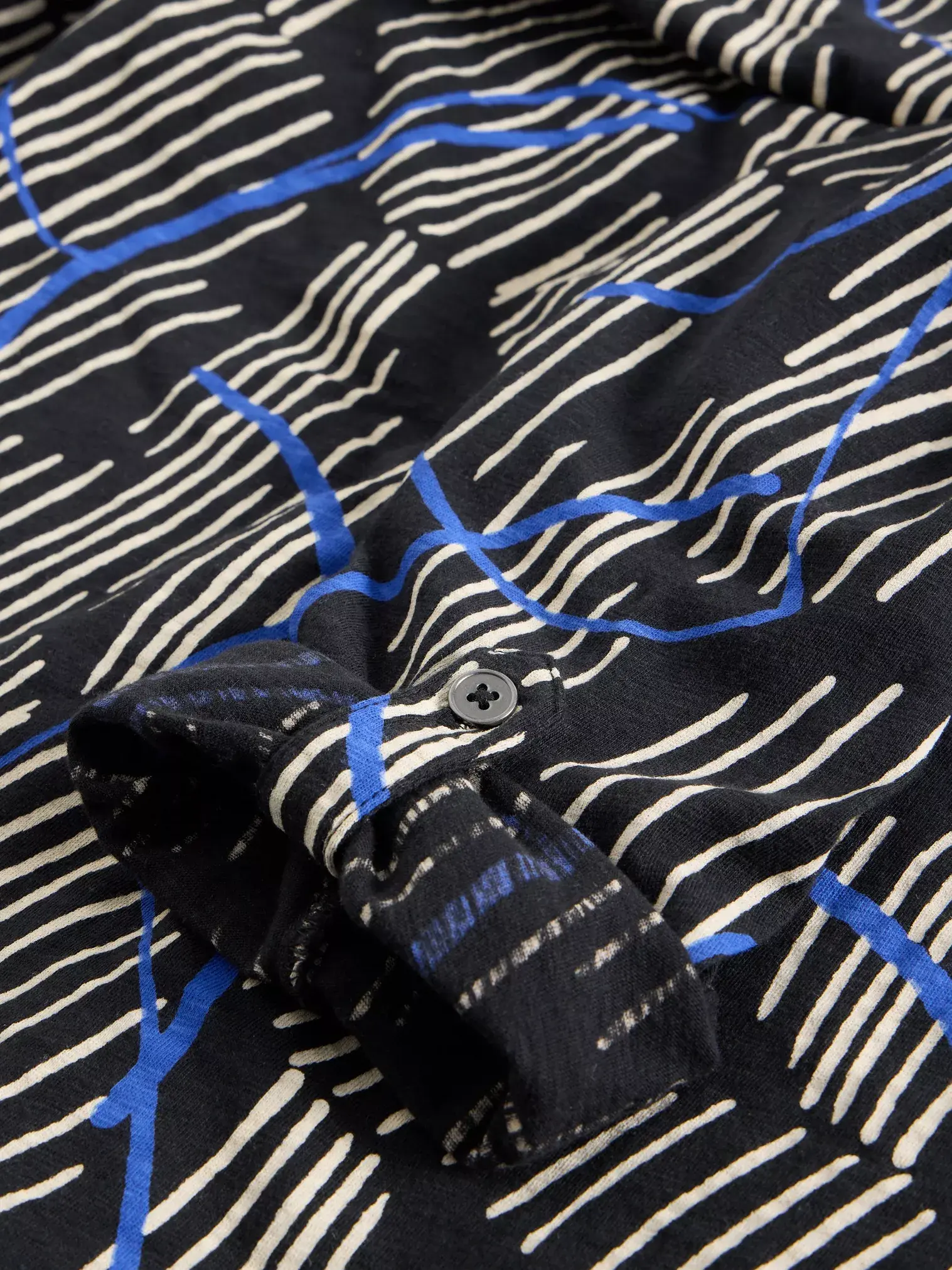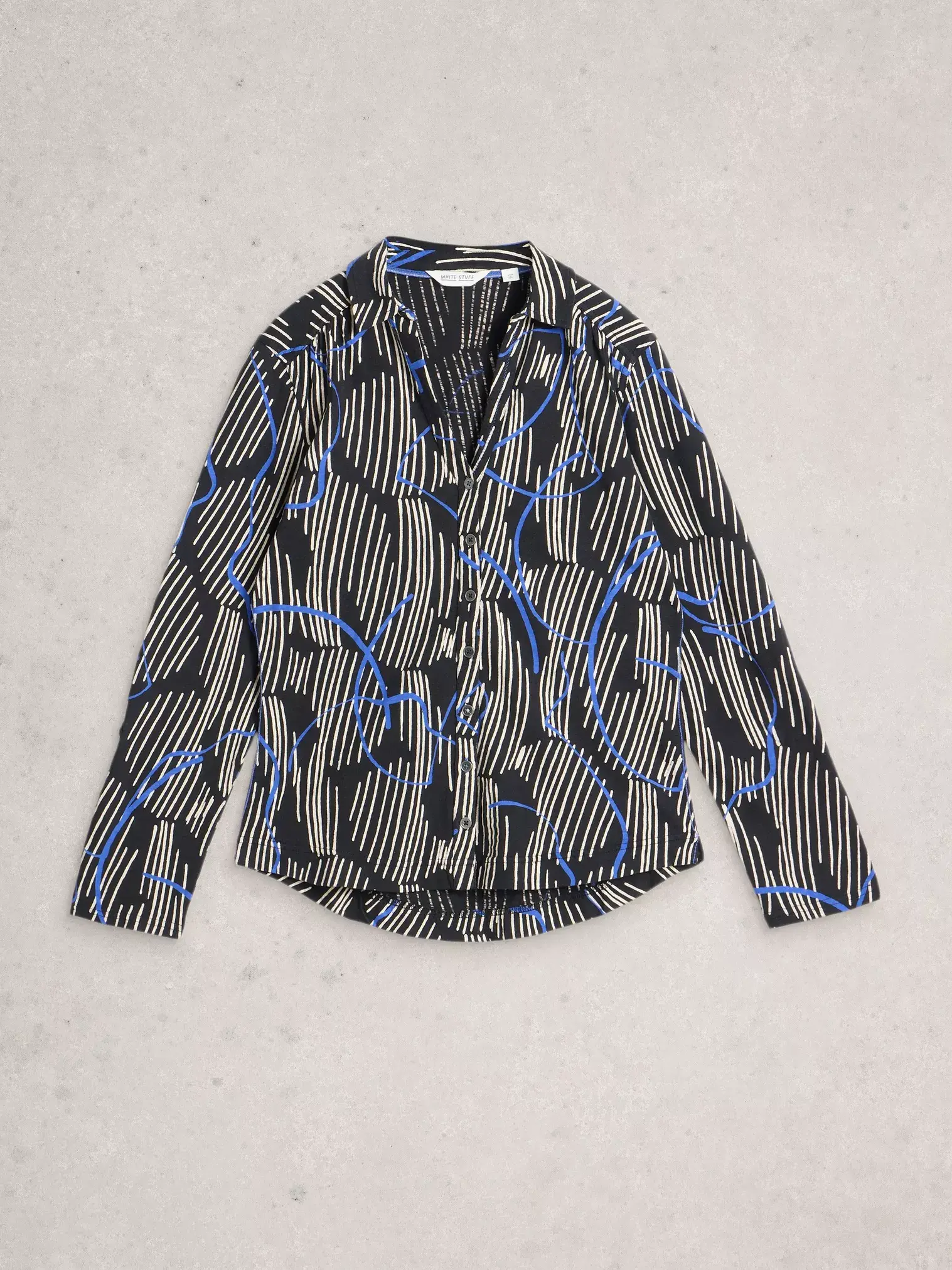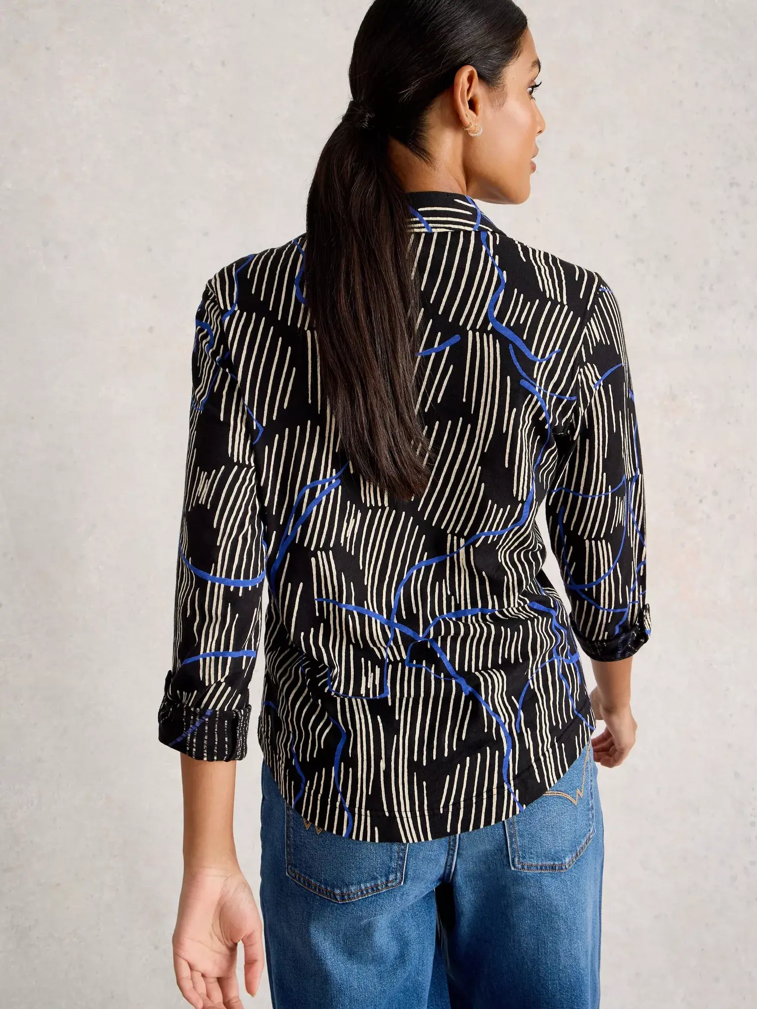 De Annie blouse van White Stuff in zwarte blouse met wit en kobalt print is een luchtige katoenen blouse met kraag en 3/4 mouwen. Comfortabel, tijdloos en eindeloos te combineren.