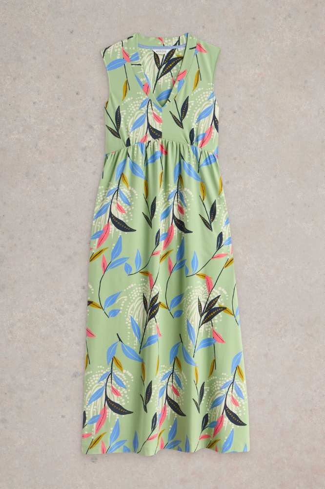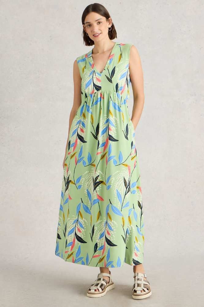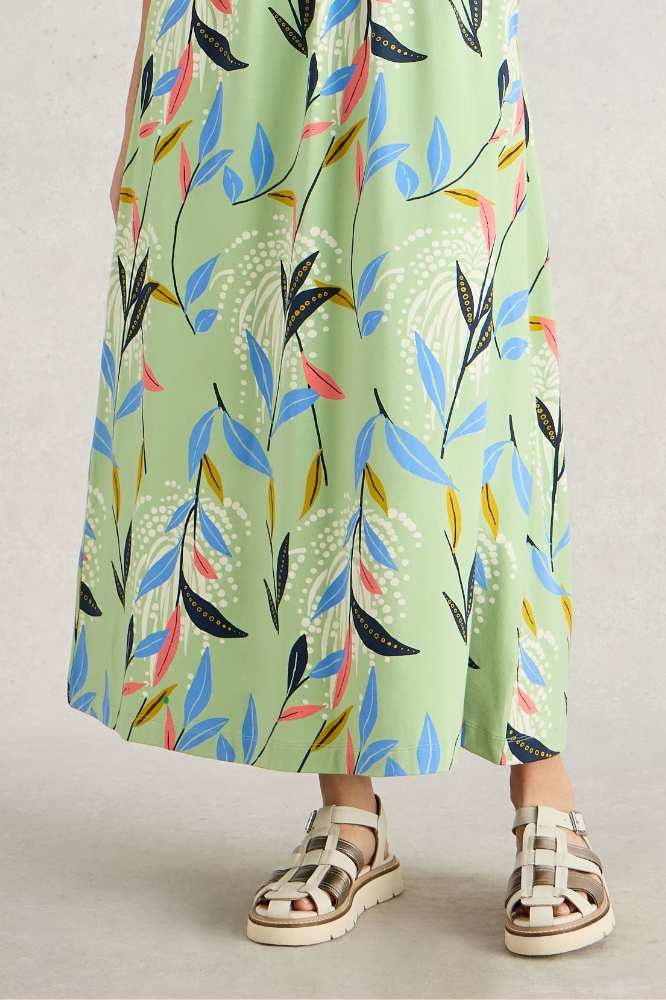 Zachte jersey maxi-jurk van White Stuff met V-hals, flatterende taille en een vrolijke print op een mintgroene achtergrond en mét zakken. Zwierig, comfortabel en stijlvol. Ideaal voor een zomerse dag. Maat 36 t/m 46.