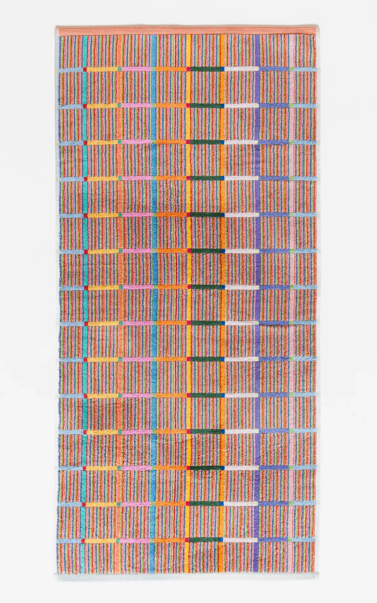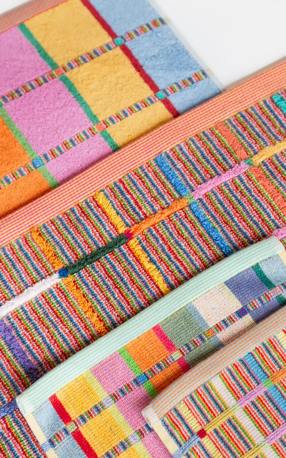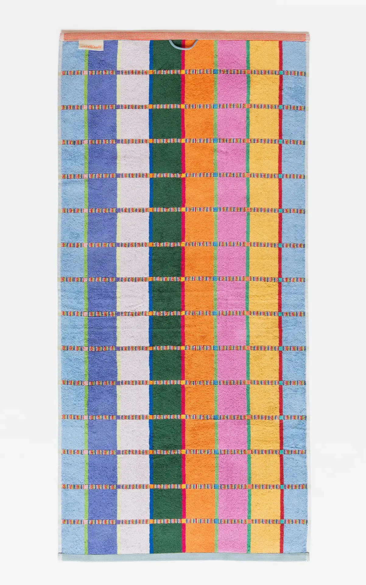 Mooie badhanddoek van zware kwaliteit textiel, 60*120 cm incl ophang lus. Gemaakt uit restgarens uit de textielindustrie, geen verspilling dus. En telkens weer verrassende kleurcombinaties. Een feestje voor in jouw badkamer toch?!