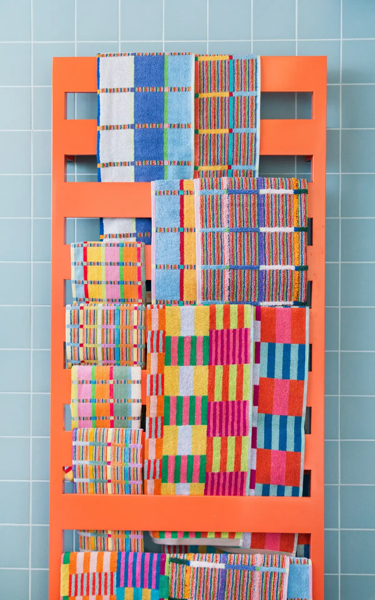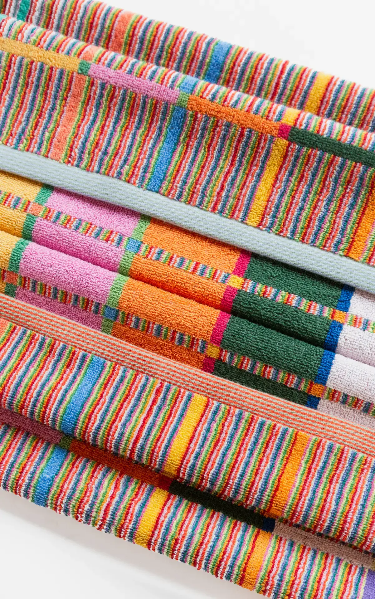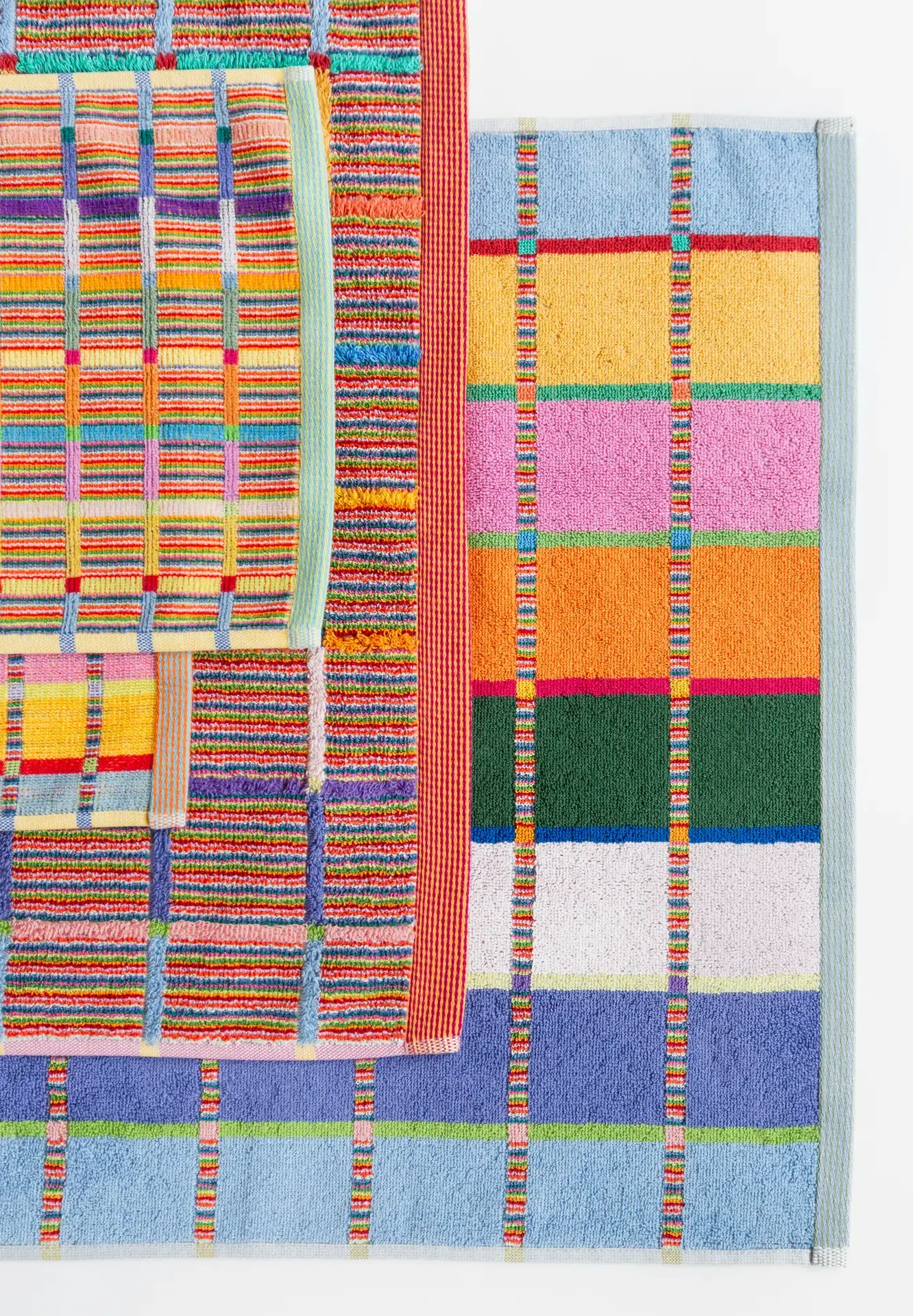 Mooie badhanddoek van zware kwaliteit textiel, 60*120 cm incl ophang lus. Gemaakt uit restgarens uit de textielindustrie, geen verspilling dus. En telkens weer verrassende kleurcombinaties. Een feestje voor in jouw badkamer toch?!