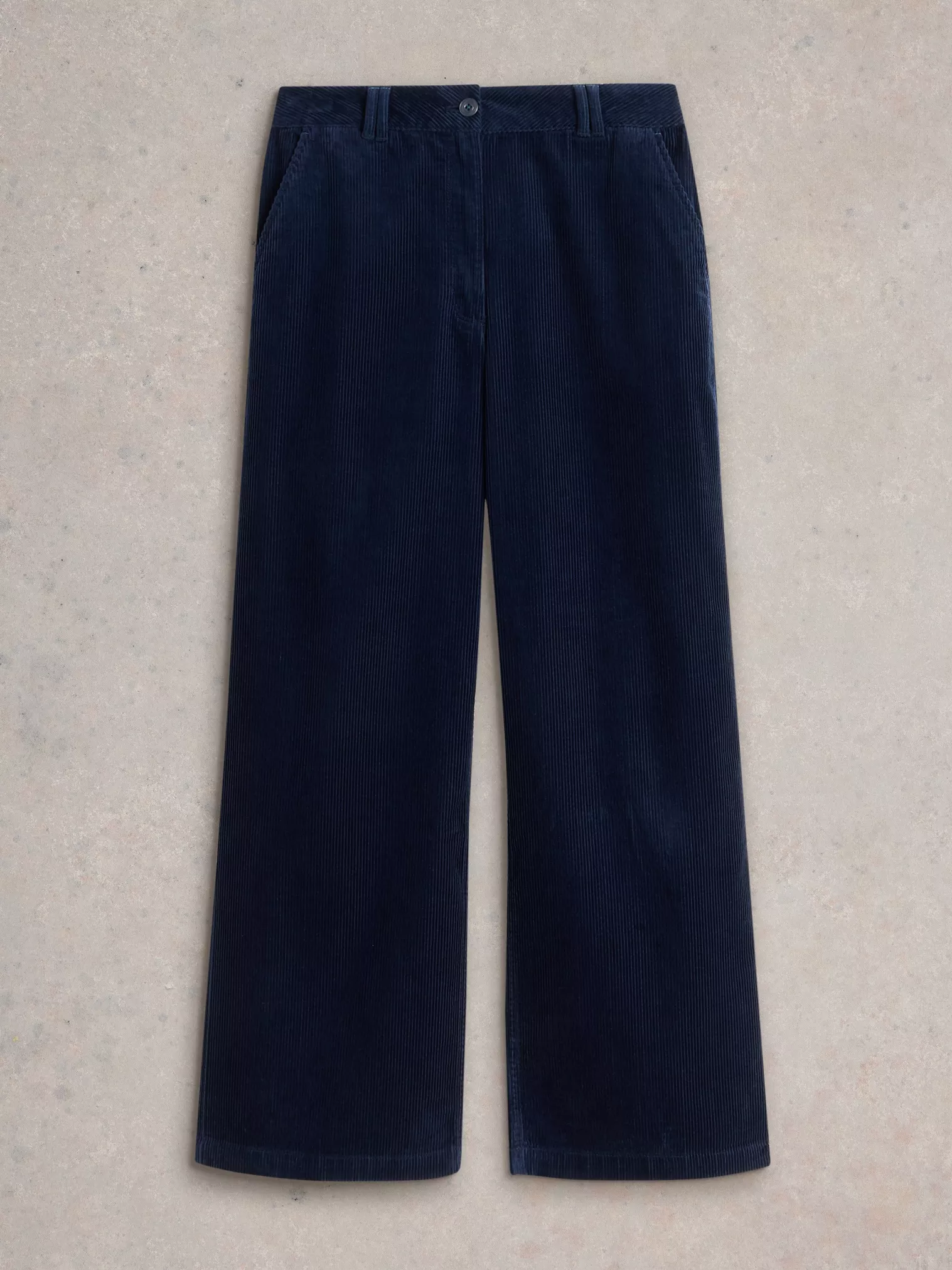 De Belle cord wide leg trousers van White Stuff is een moderne klassieker met een stoere uitstraling. De diepe blauwe kleur en het brede ribcord geven de broek karakter, terwijl de hoge taille en de wijde pijpen zorgen voor een comfortabele en flatterende pasvorm.