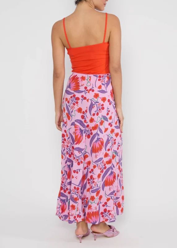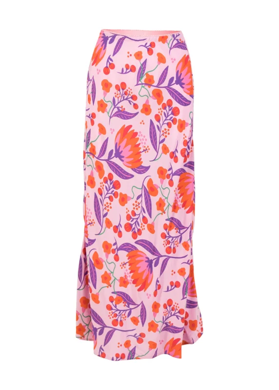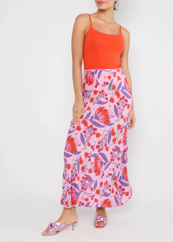 Heerlijke maxirok van Blutsgeschwister van 100% viscose (ecovero) . Zachtroze ondergrond met paars, oranje, groene print. Elastische boord