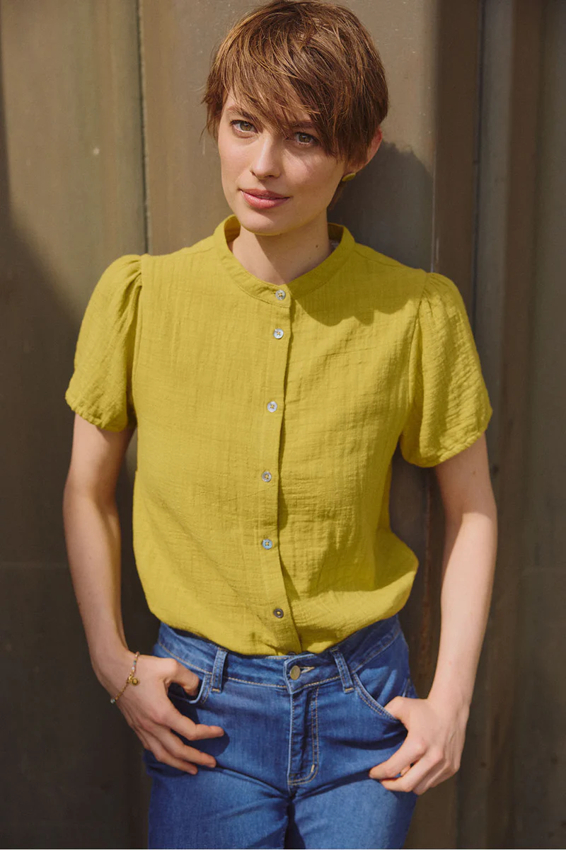 Blouse Elenaa in avocado green is zo’n stuk dat je aantrekt en meteen denkt: ja, dit klopt. Gemaakt van 100% biologisch katoenen mousseline, licht en zacht op de huid. Fris van kleur, rustig van lijn – maar met nét dat beetje karakter.