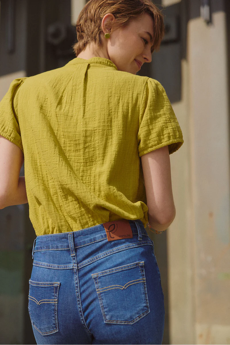 De Blouse Elenaa is gemaakt van 100% biologisch katoen (GOTS-gecertificeerd) in een mooie slub mousseline. Dat betekent: een subtiele structuur in de stof, een beetje speels, niet helemaal glad. Je ziet het en je voelt het. Licht, luchtig en zacht – alsof de stof al een beetje met je heeft meegeleefd.