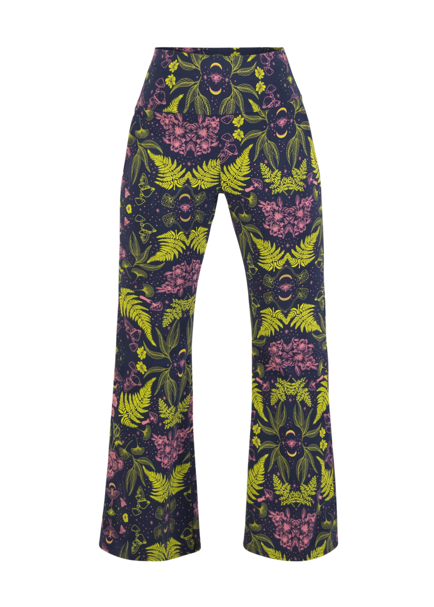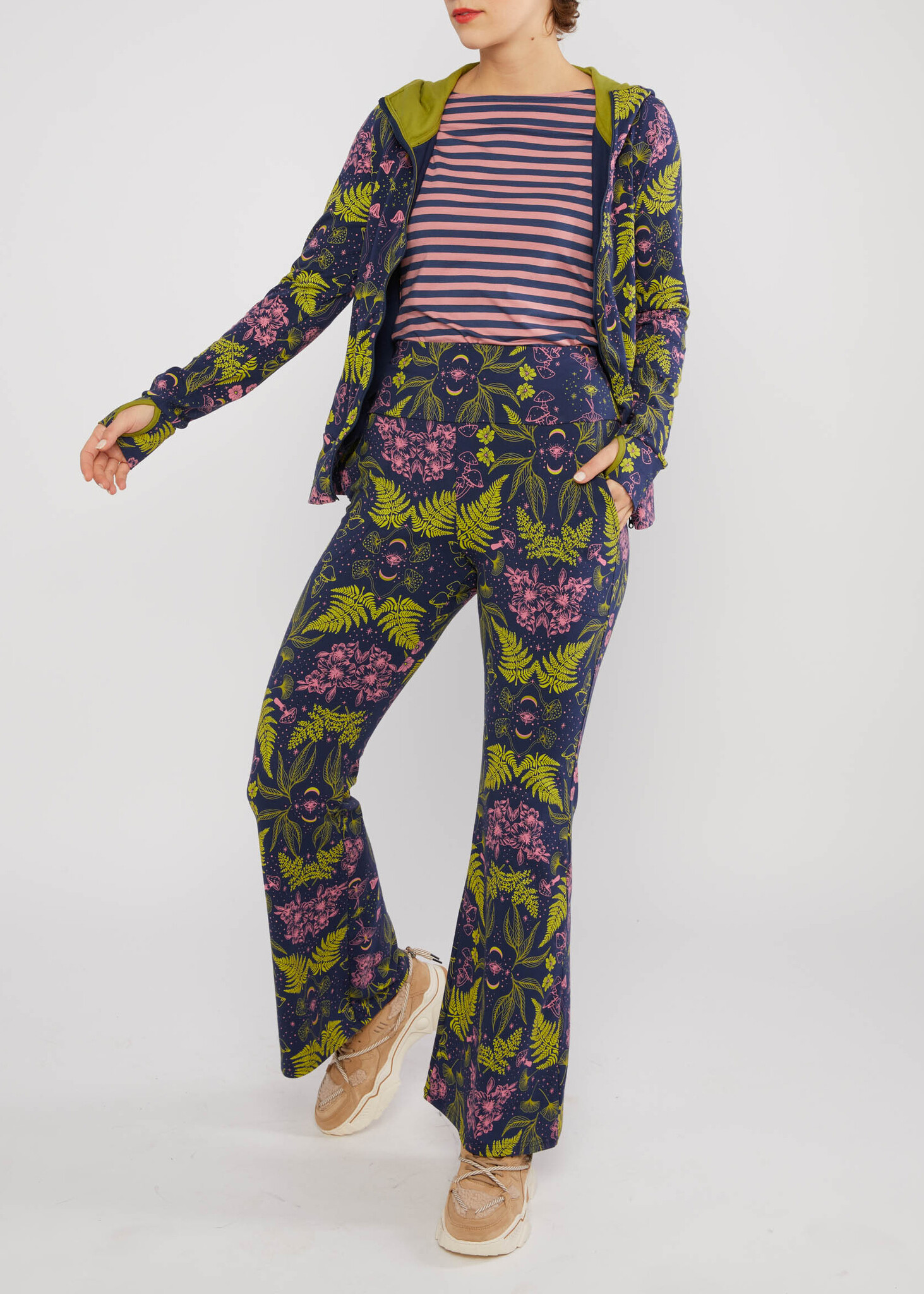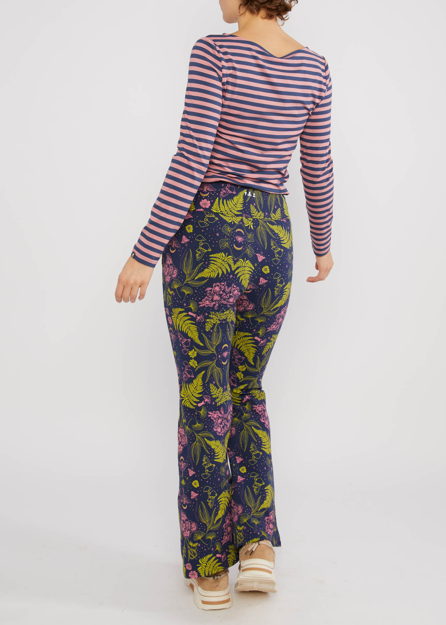 Aansluitende broek met flared pijpen en fijne elastische boord, hoge taille. De broek heeft zakken op heuphoogte en is gemaakt van zachte katoenjersey (95% katoen en 5% elasthan)