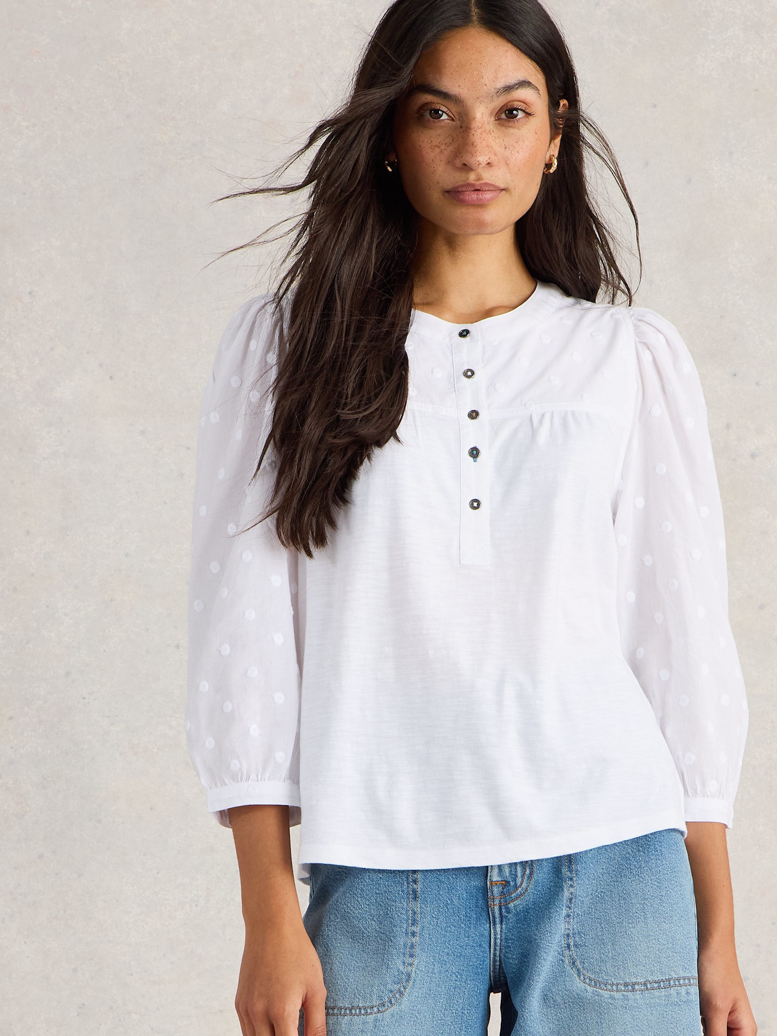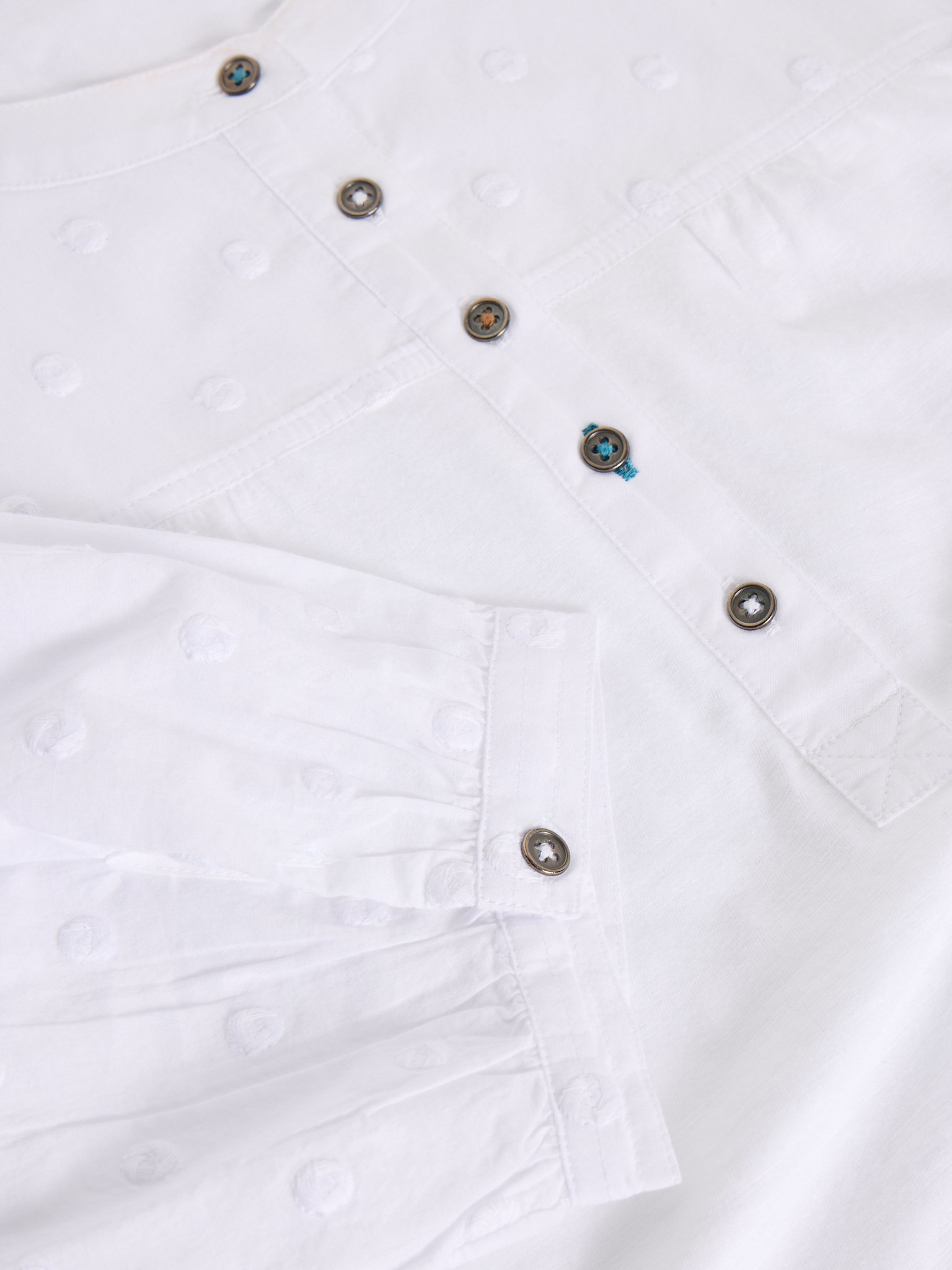 Prachtige witte top van White Stuff met een mooie pofmouw. De drie kwart mouw heeft een geborduurd noppen patroon. Het shirt heeft een ronde hals met knoopjes tot borsthoogte. Plooitjes aan de achterkant.