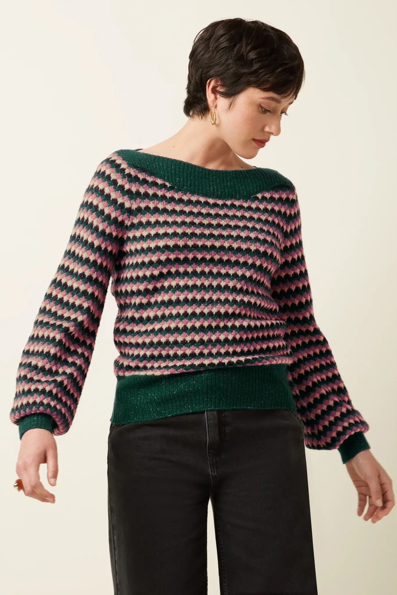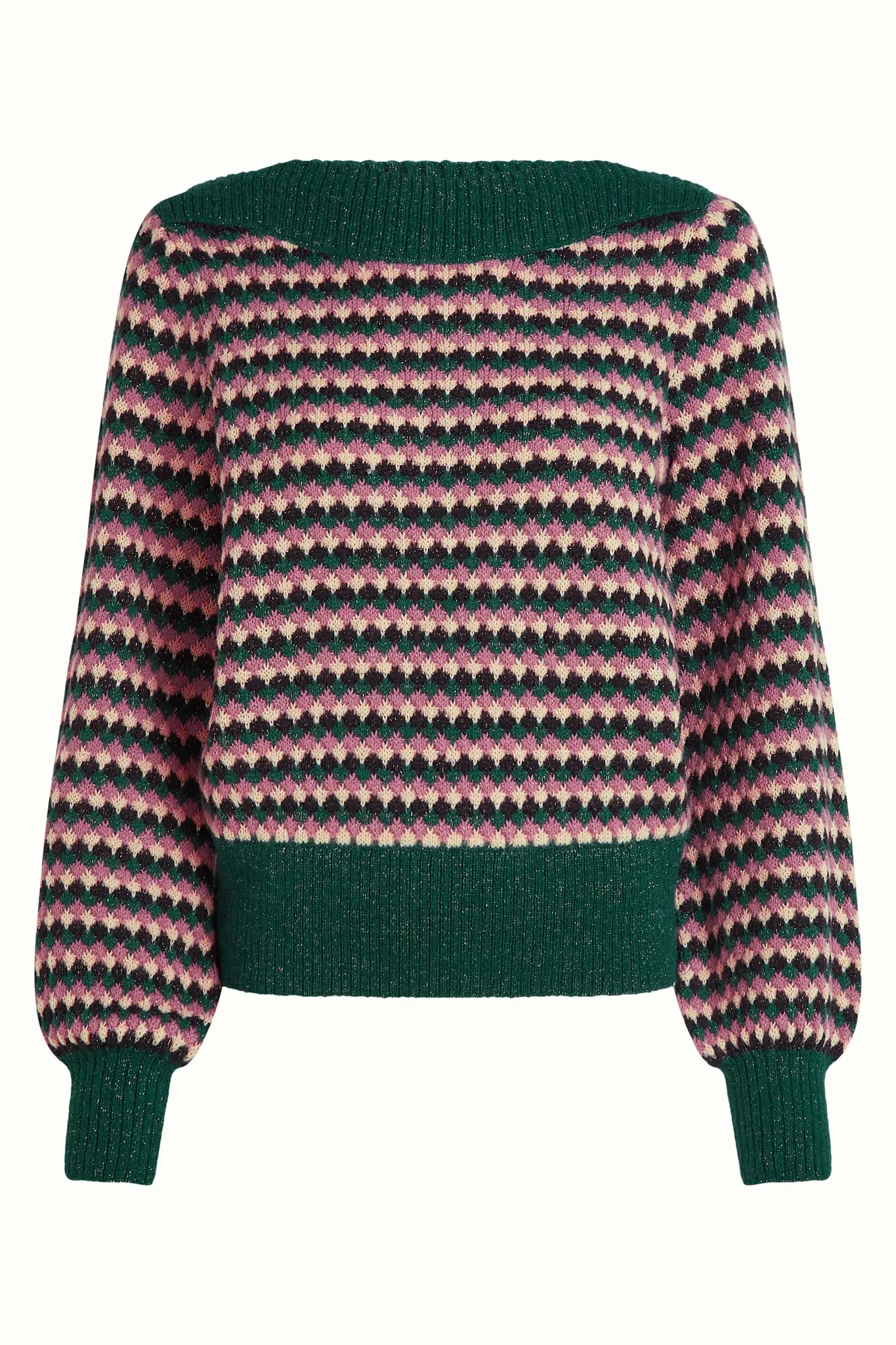 De King Louie Erin Top Flora in pine green heeft een boatneck, lange mouwen en contrasterende boorden. Gemaakt van glitter knit met stretch en een grafisch patroon. Een comfortabele top die je outfit direct een feestelijke uitstraling geeft.