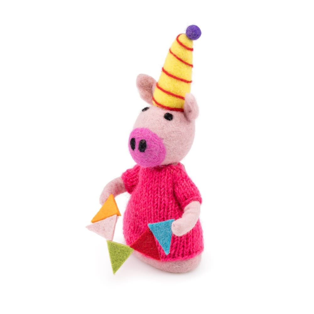 Een echt feestvarken met een roze gebreide trui, gele muts en slinger in de hand. Leuk bij een verjaardag, in de klas of als eiwarmer bij een verjaardag ontbijt. 22 cm hoog, ook als handpop voor kinderhandjes geschikt. Hier word je toch blij van! 22 cm