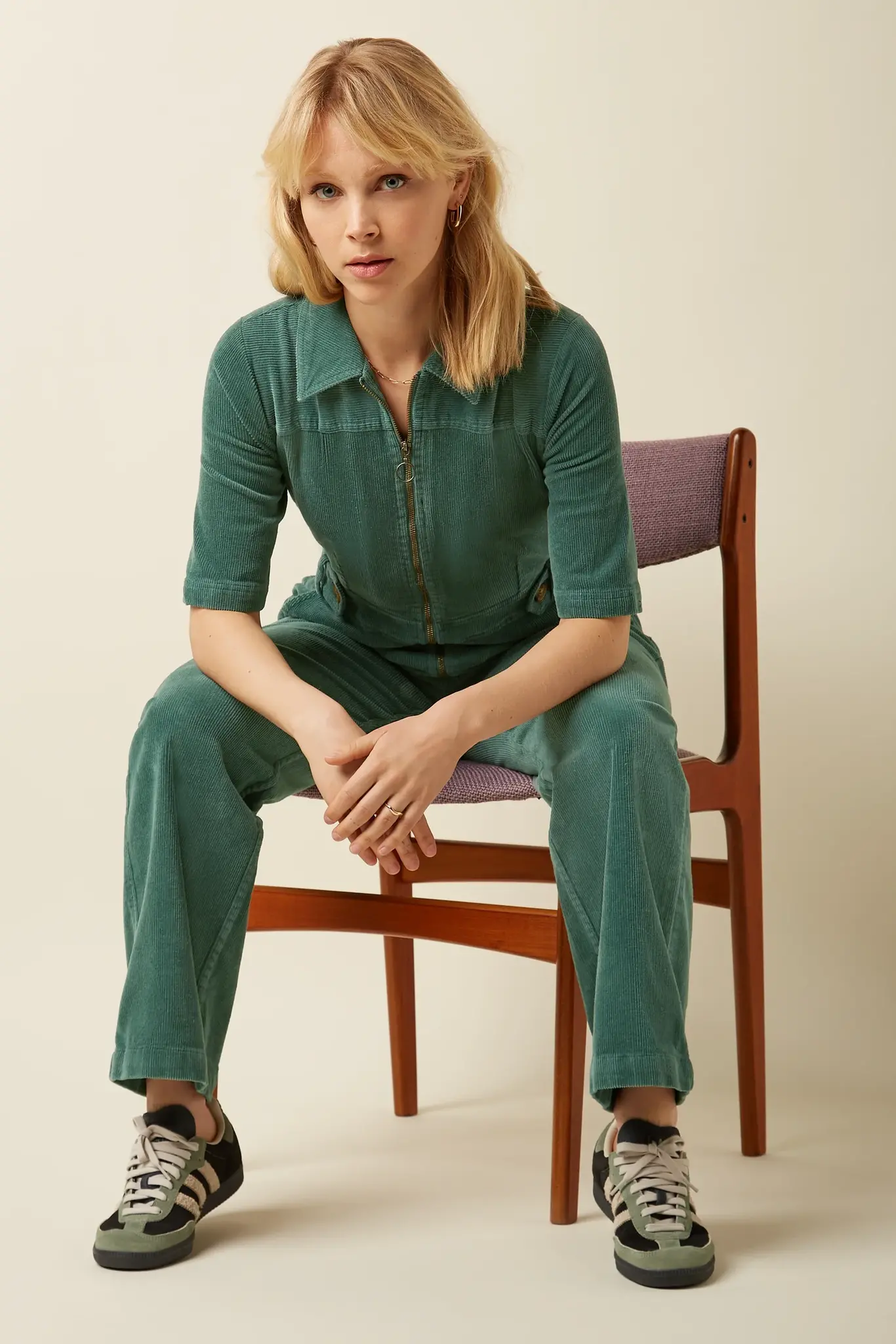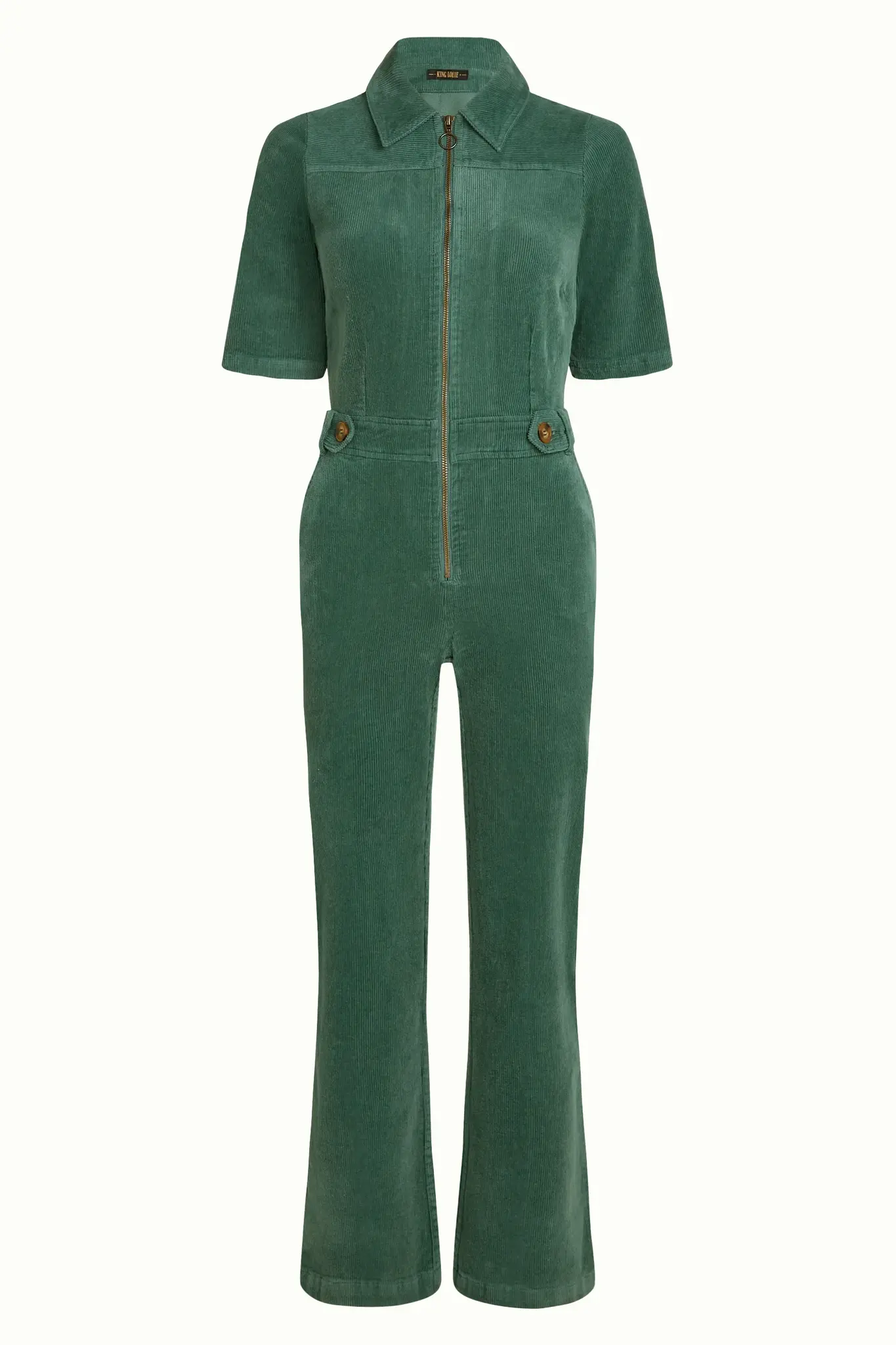 De King Louie Garbo Zip Jumpsuit in matcha green: corduroy, korte mouwen, licht uitlopende pijpen en rits. Duurzaam, stijlvol en comfortabel