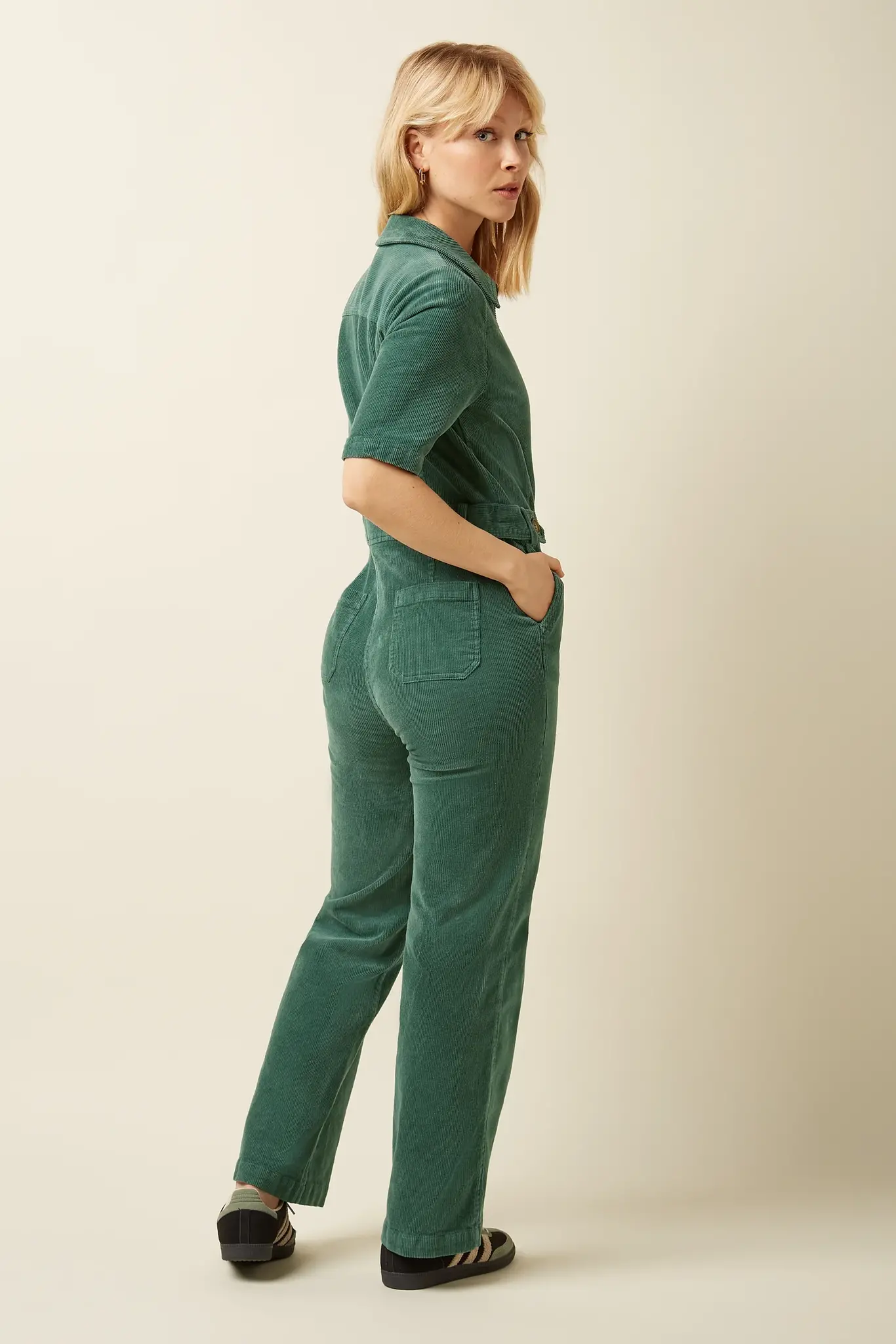 Met zijn klassieke kraag, korte mouwen en slanted pockets combineert de Garbo jumpsuit een tijdloze snit met praktische details. De vaste tailleband zorgt voor een vrouwelijke, flatterende pasvorm, terwijl de licht uitlopende pijpen een speelse en elegante touch toevoegen. Dankzij de ritssluiting is hij eenvoudig aan en uit te trekken – ideaal voor dagelijks gebruik.