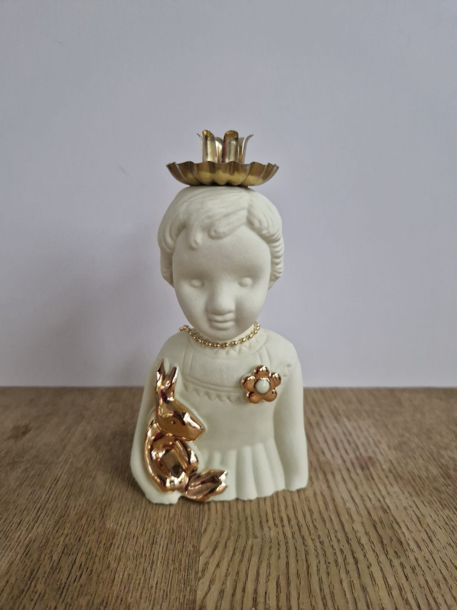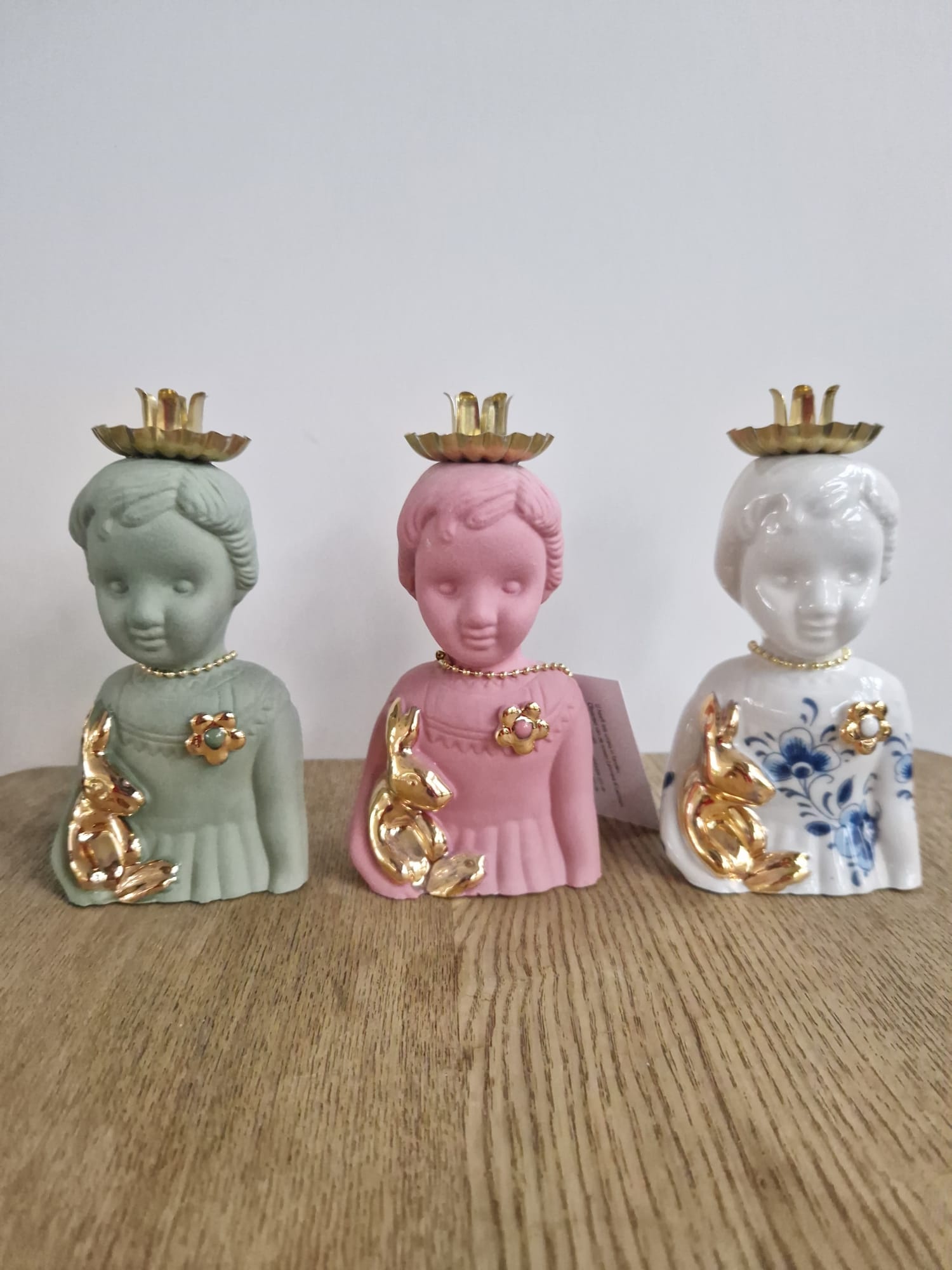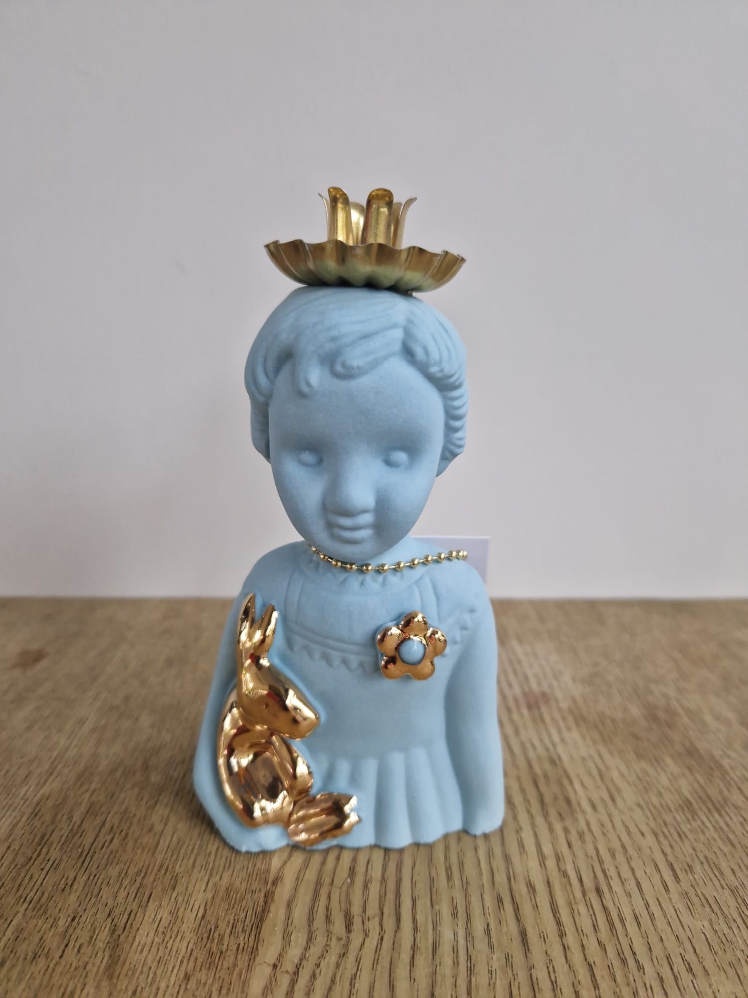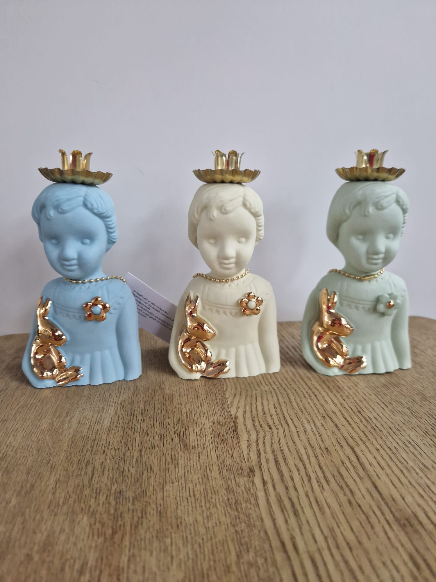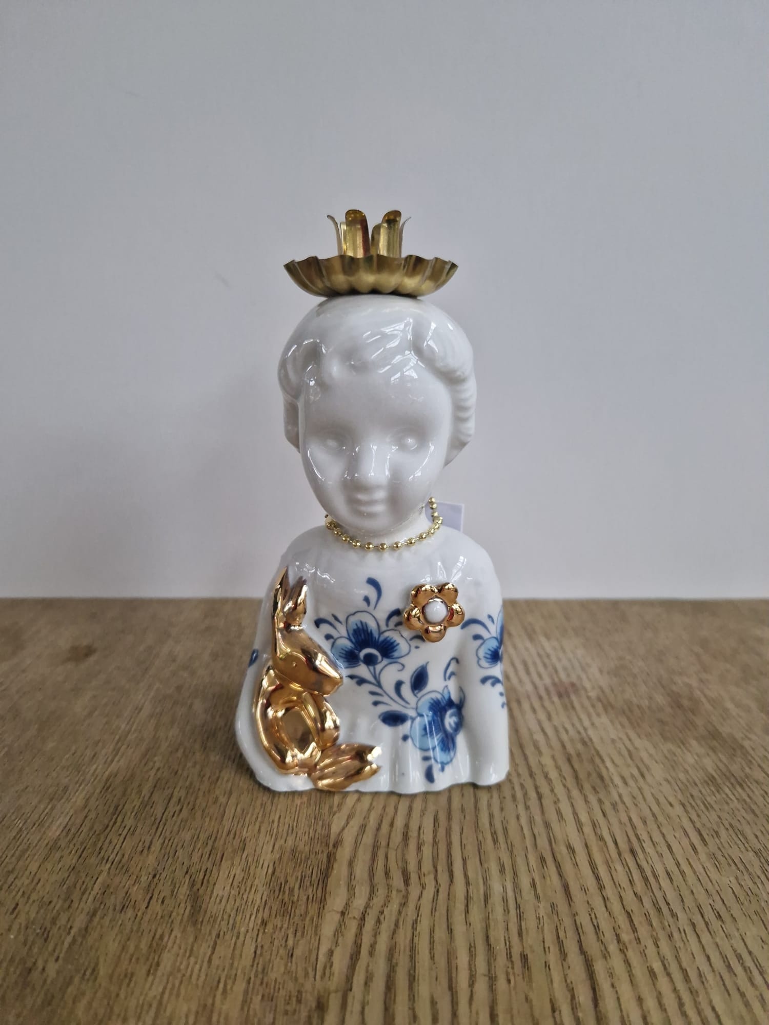Deze schattige kandelaar: halfkaars pupkes zijn handgemaakt van porselein met 14% goud details. Hoogte is 14 cm. Inclusief 2 handgemaakte kaarsjes.