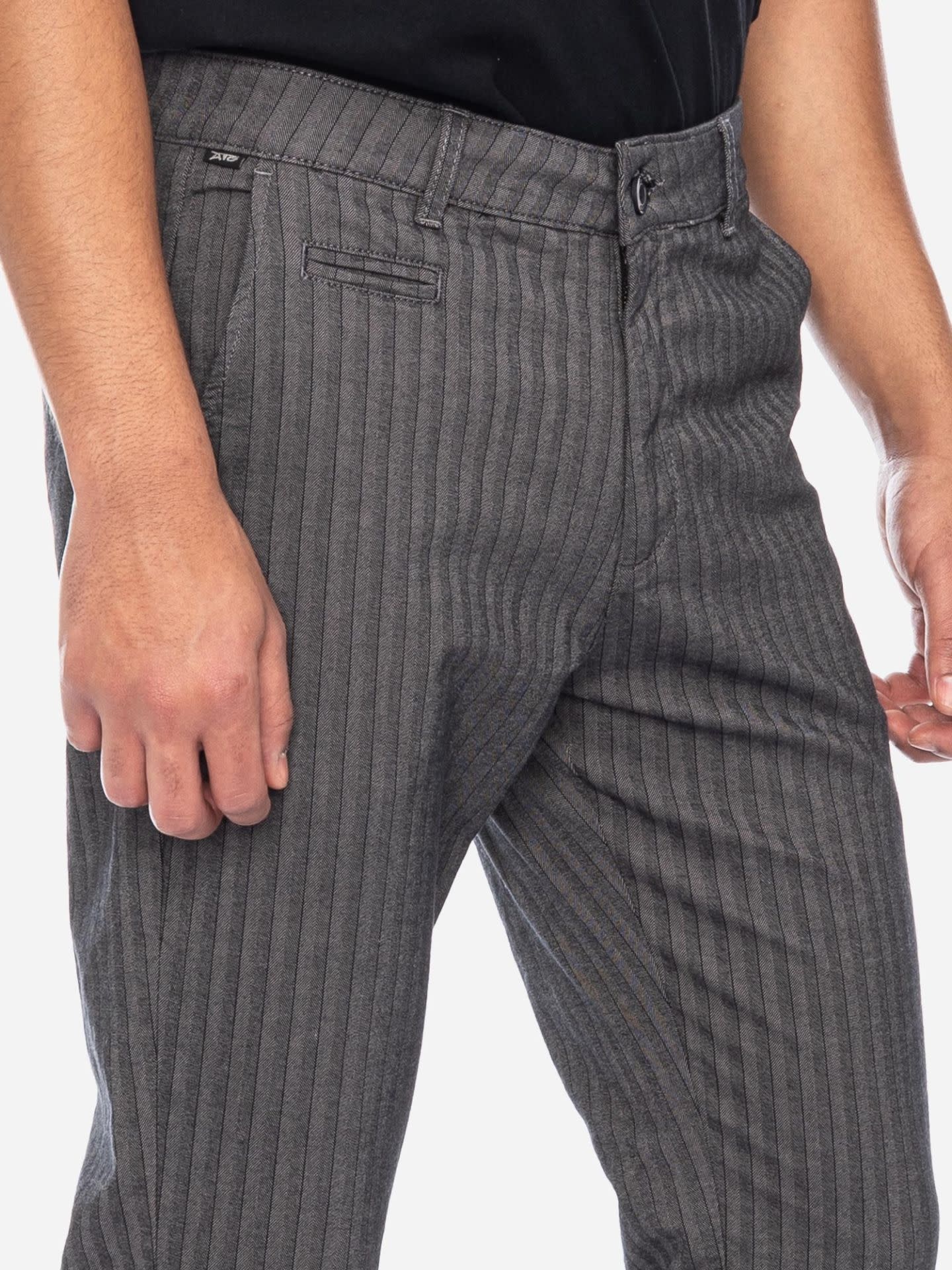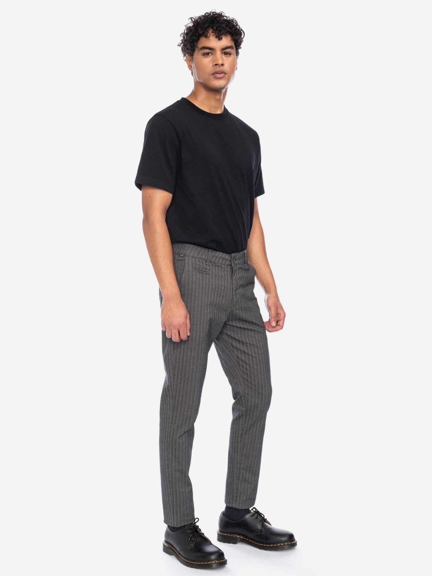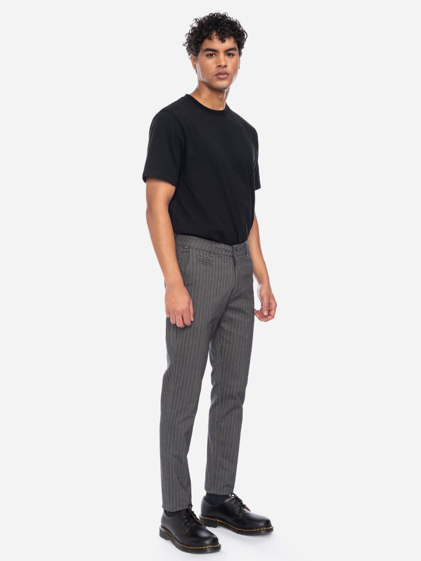 Slank gesneden herenbroek, chinomodel, met steekzakken en achter paspelzakken, van ATO Berlin in grijs katoen met fijne streep. Comfortabel, stijlvol en eerlijk geproduceerd. Voor elke dag en elk moment.