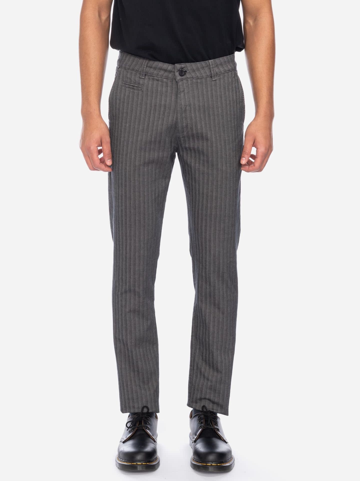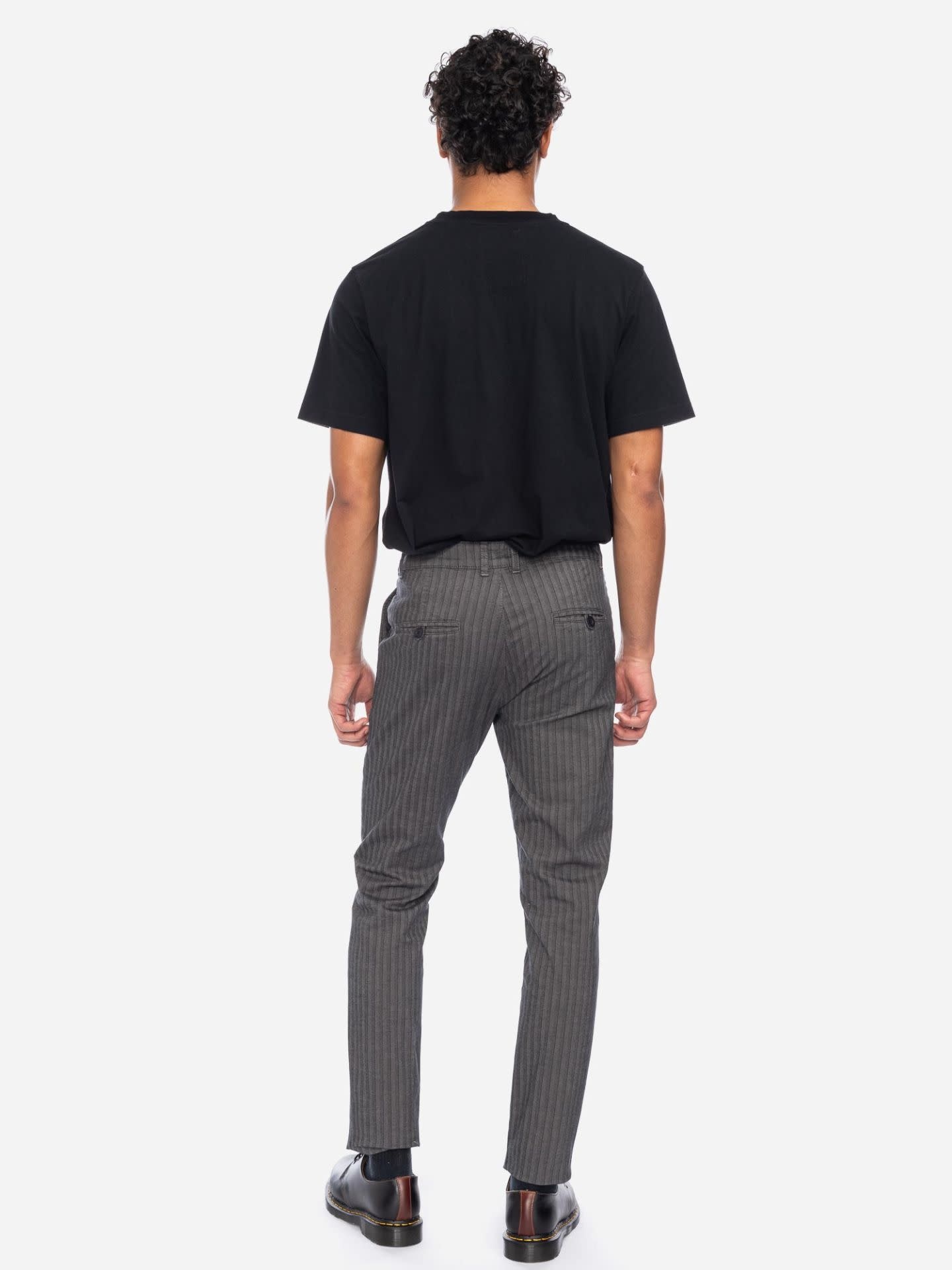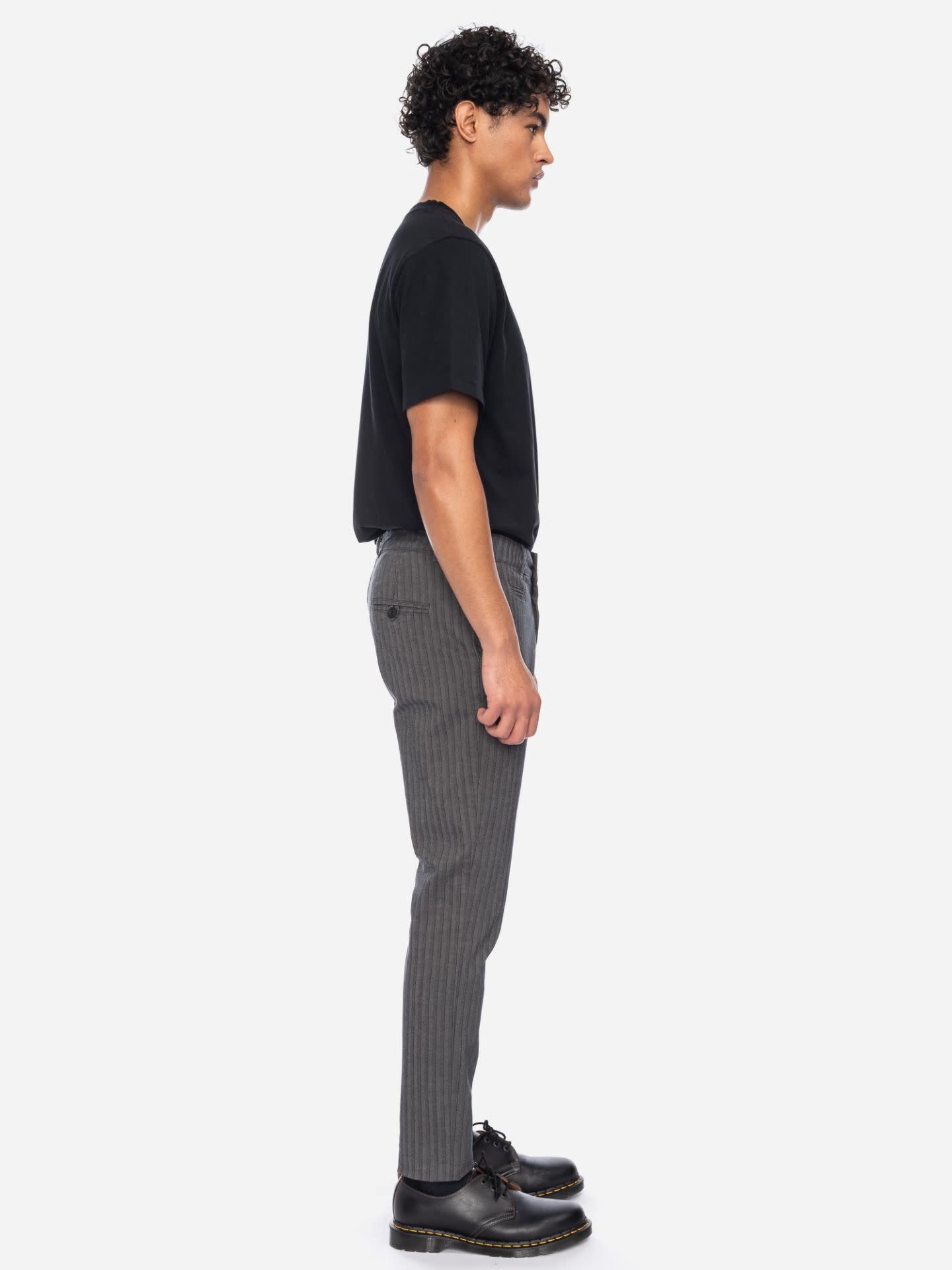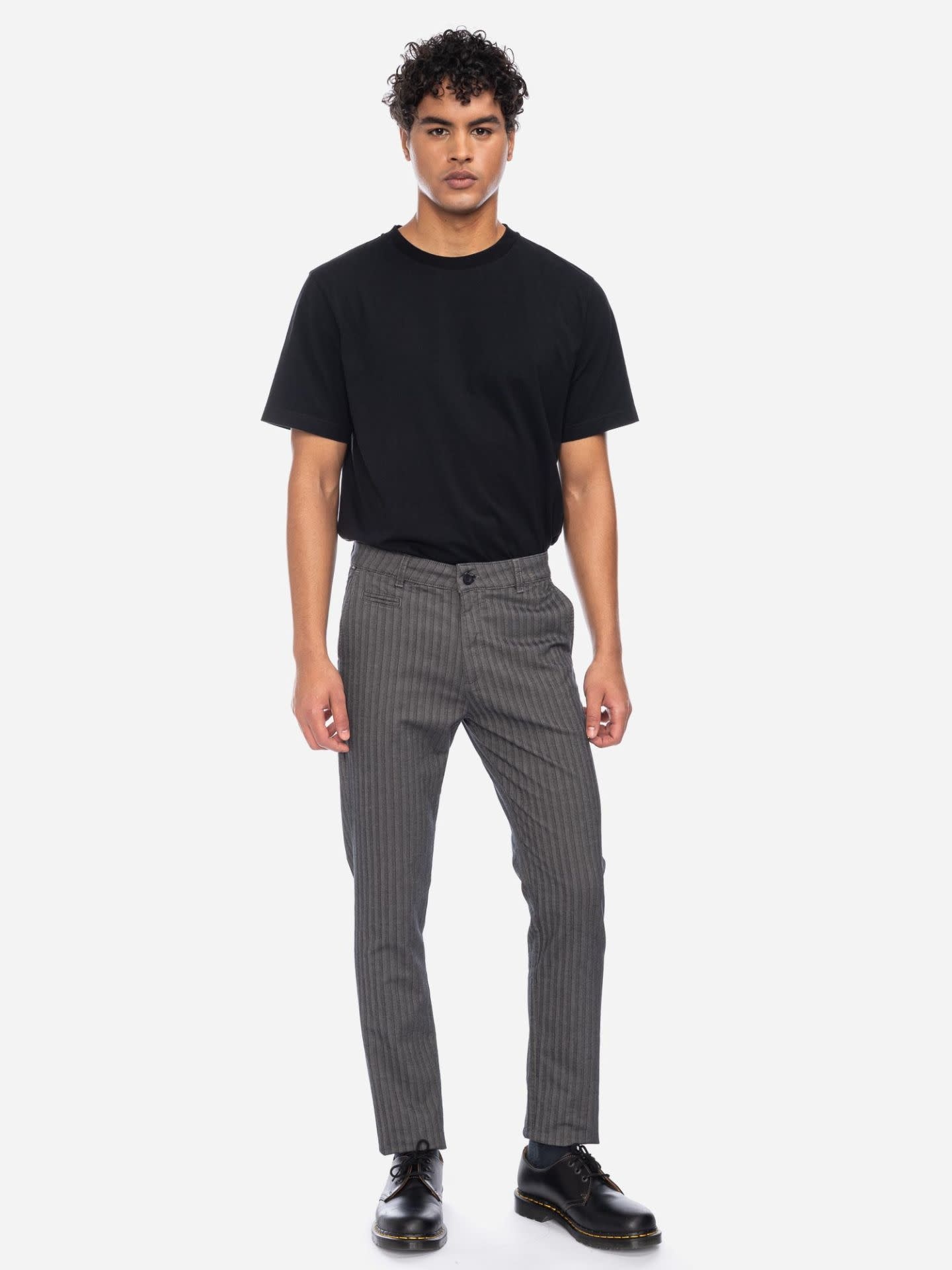 Slank gesneden herenbroek, chinomodel, met steekzakken en achter paspelzakken, van ATO Berlin in grijs katoen met fijne streep. Comfortabel, stijlvol en eerlijk geproduceerd. Voor elke dag en elk moment.