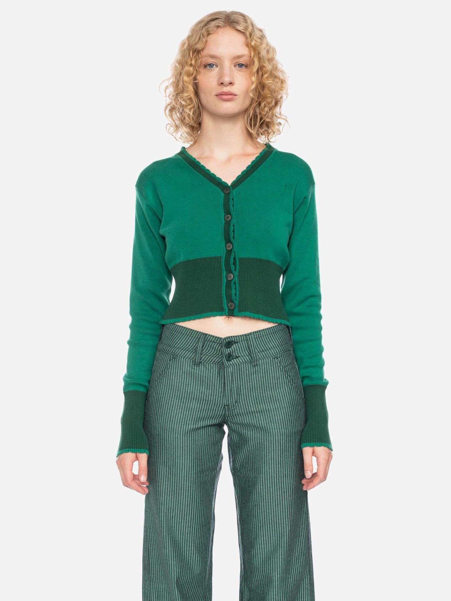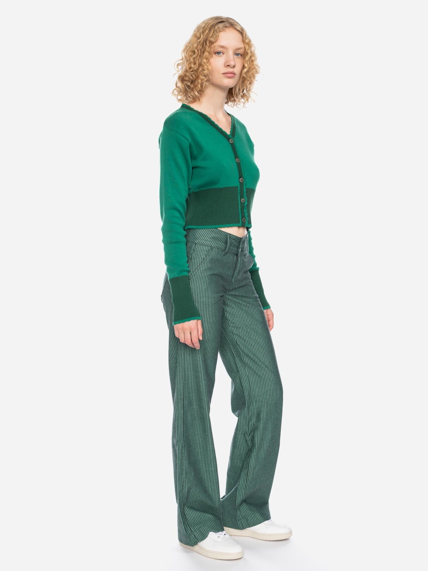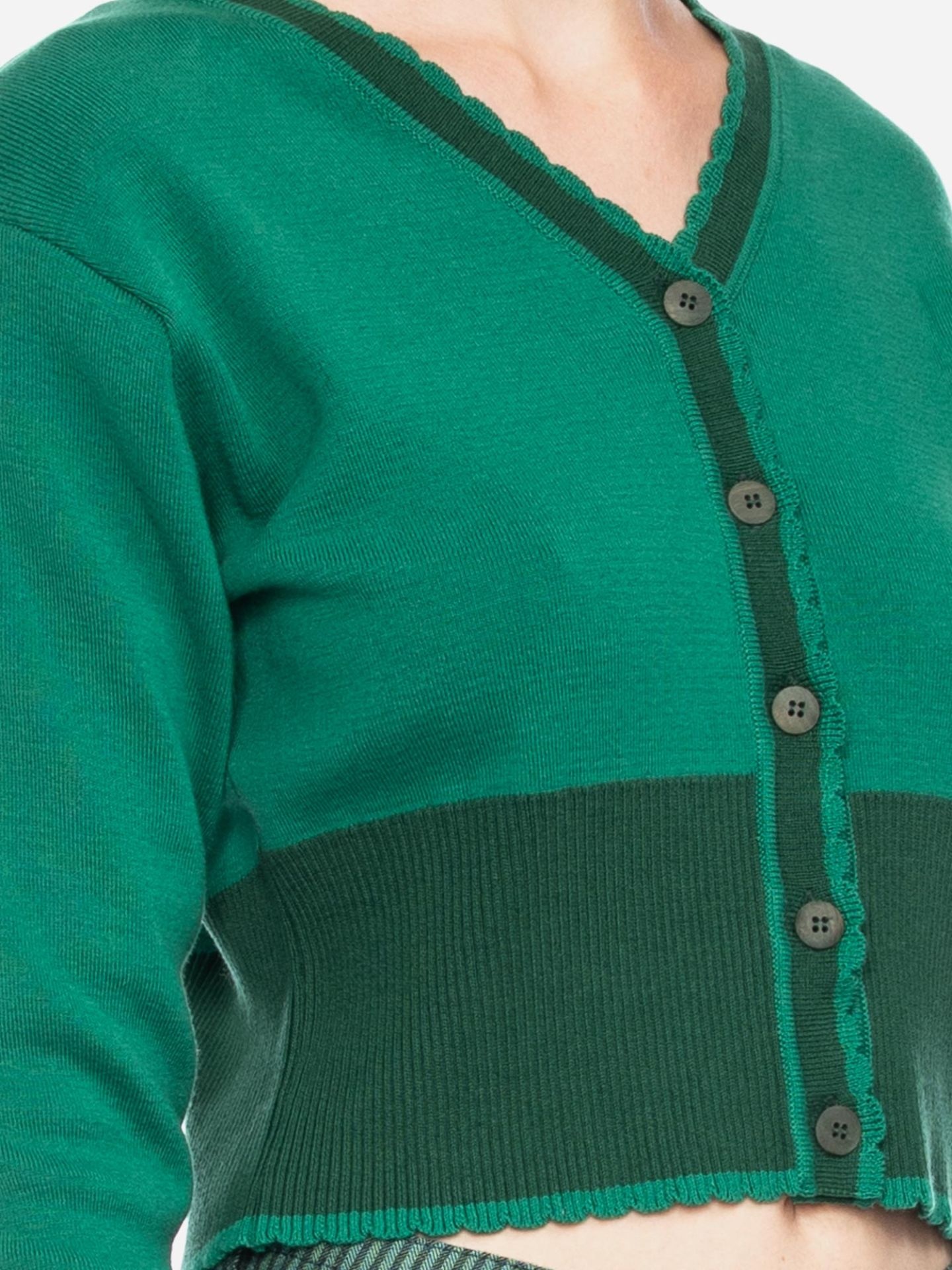 Wat een prachtig kort, getailleerd vestje in twee kleuren groen is dit. Gemaakt van 100% biokatoen. Veelzijdig te combineren, ideaal als je meerdere laagjes wilt dragen. Leuk ook op een rok of een jurk omdat het vestje mooi de taille accentueert.