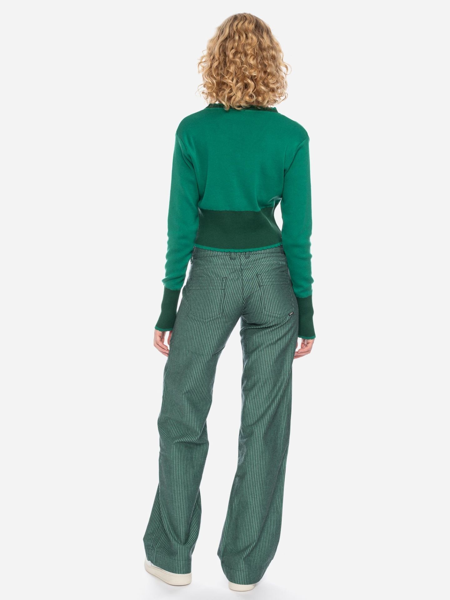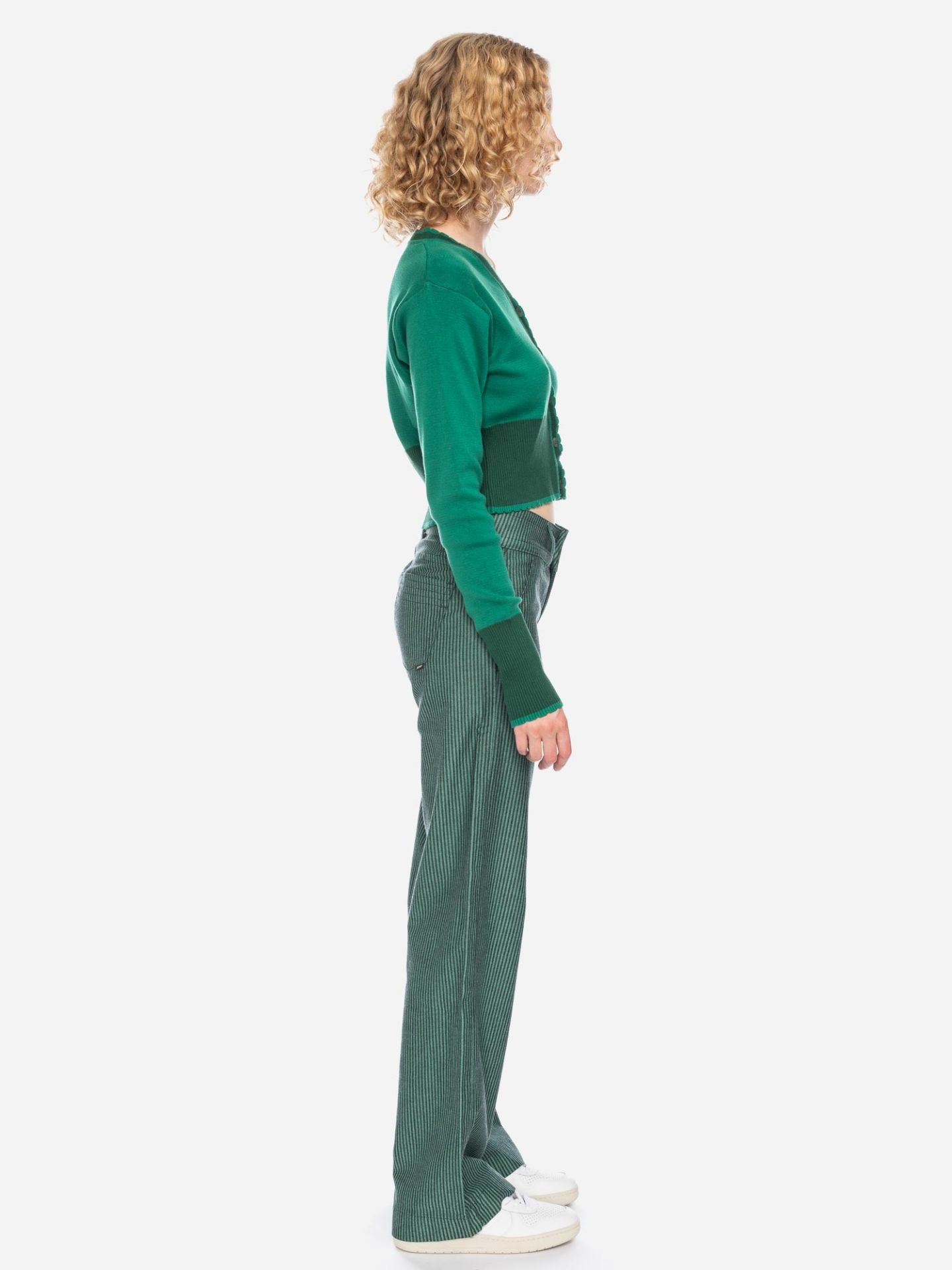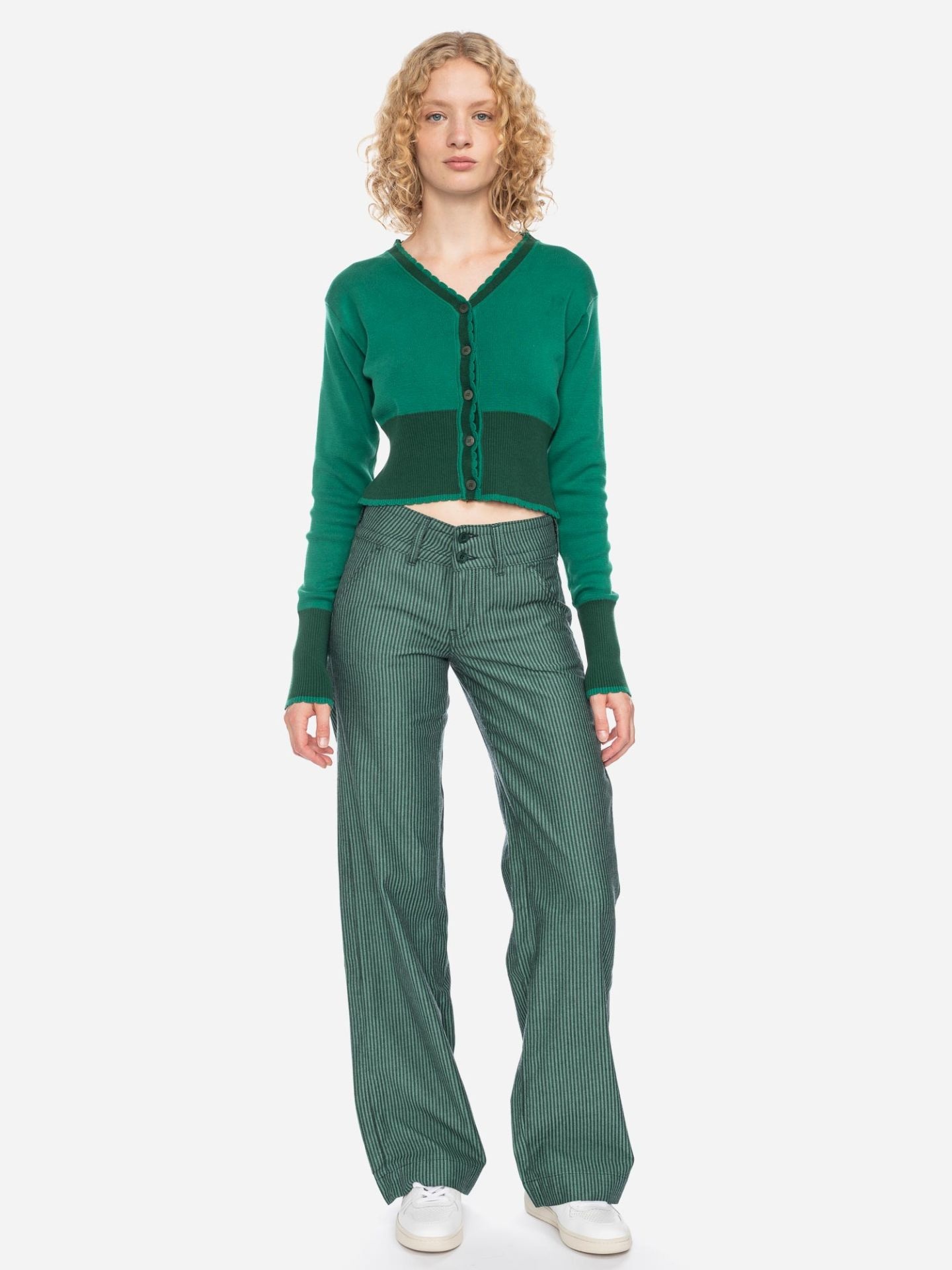 Wat een prachtig kort, getailleerd vestje in twee kleuren groen is dit. Gemaakt van 100% biokatoen. Veelzijdig te combineren, ideaal als je meerdere laagjes wilt dragen. Leuk ook op een rok of een jurk omdat het vestje mooi de taille accentueert.