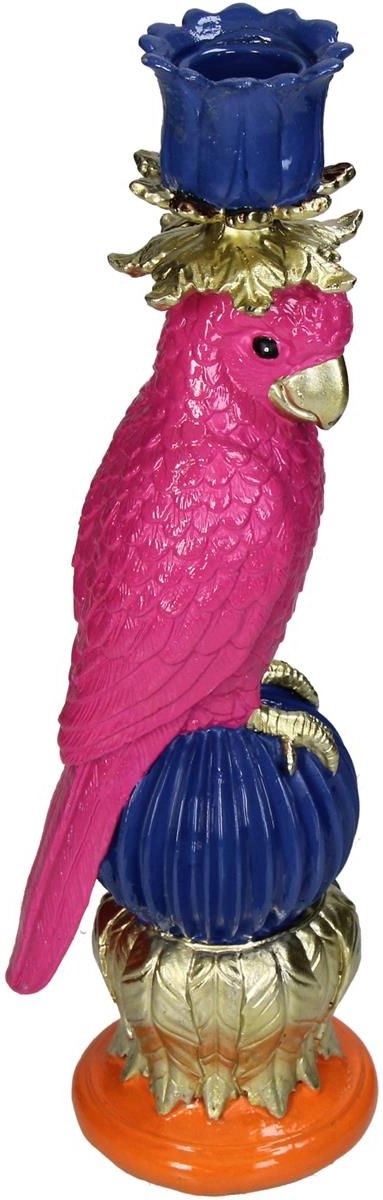 Vrolijke polyresin kandelaar met kleurrijke vogel (27 cm). Geschikt voor dinerkaarsen. Een sfeervolle eyecatcher in warme tinten met een vleugje goud.