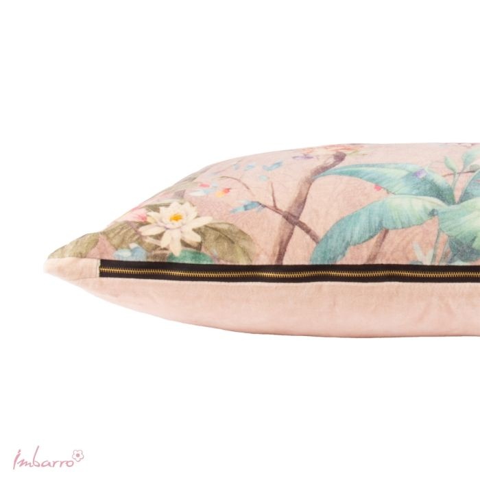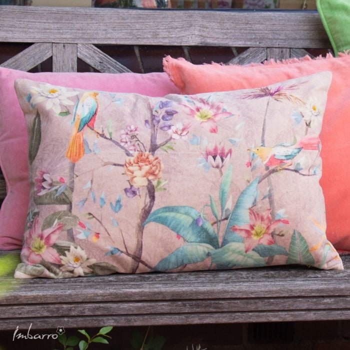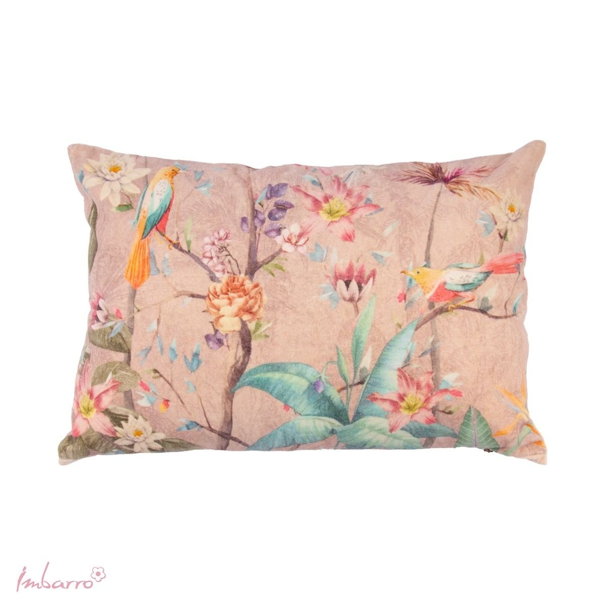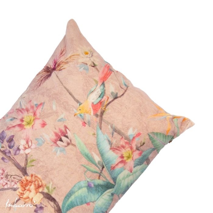 Een zacht velvet kussen met een verfijnde botanische print in pasteltinten. Vogels, bloemen en bladeren vormen samen een rustig en sfeervol geheel. Een subtiele blikvanger op je bank of fauteuil.