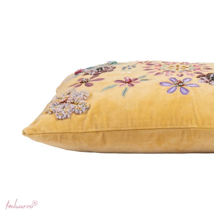 Dit is er zo eentje waar je vanzelf even bij stil blijft staan. Kussen Camille voelt fluweelzacht aan en is gemaakt van 100% katoen, met een warme zachtgele basis die je interieur meteen oplicht. De bloemen zijn rijk geborduurd en dankzij de getufte borduurtechniek hebben ze die mooie diepte en structuur. Niet strak of perfect, maar juist levendig en een tikje speels.