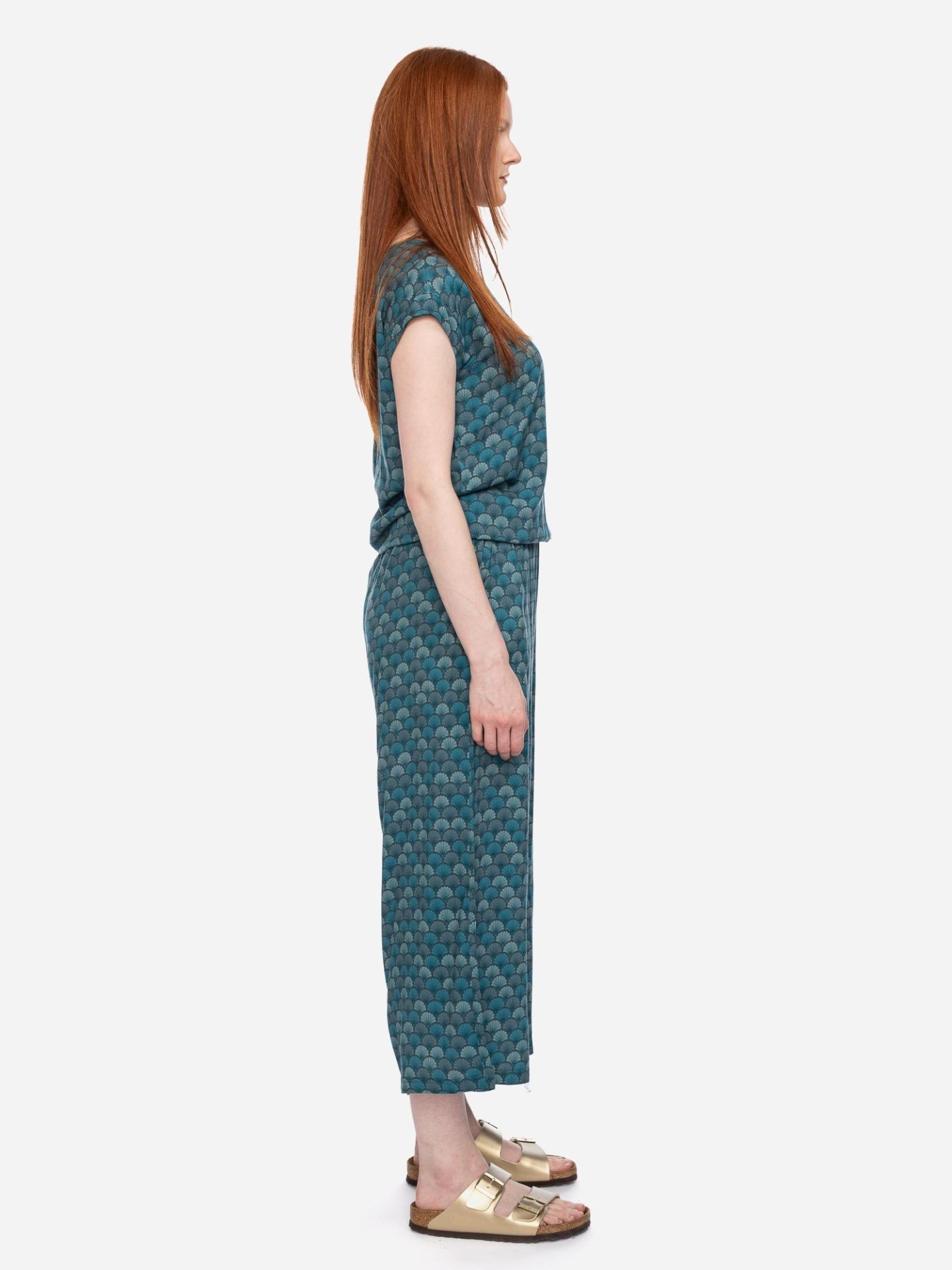 De Leo top van Ato Berlin in teal/petrol heeft een prachtig, harmonieus patroon in blauw- en groentinten. Fris, maar niet fel. Rustig, maar zeker niet saai. Het dessin geeft die typische Ato-uitstraling: eigenzinnig, een tikje retro en toch tijdloos. Precies waarom wij zo dol zijn op dit merk.