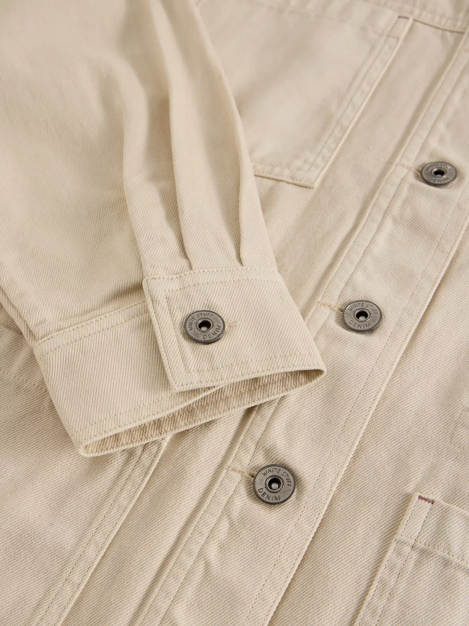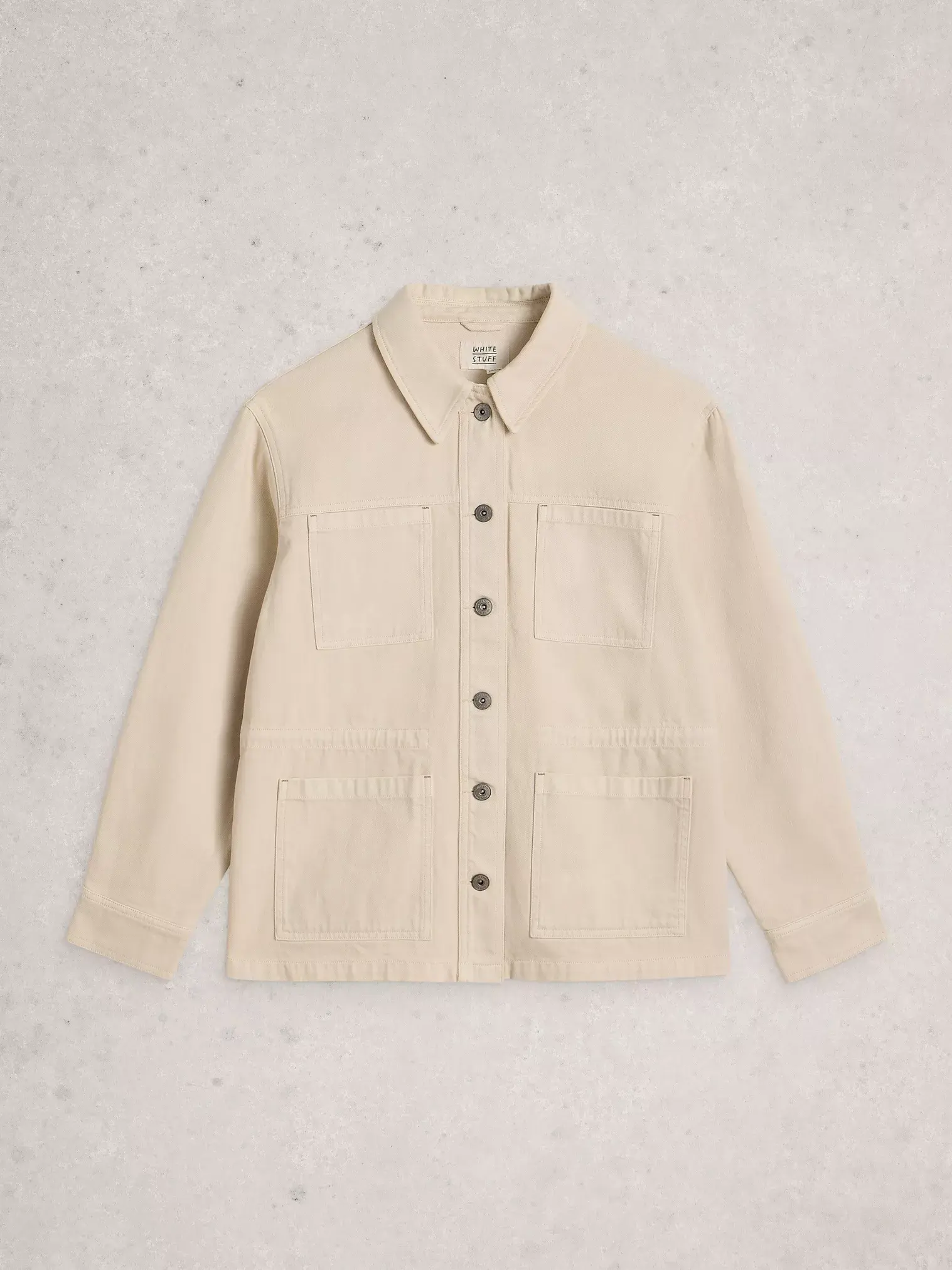 Utility denimjas van White Stuff van biologisch katoen. Met vier zakken en een verstelbare taille voor een relaxte of getailleerde look. Tijdloos en comfortabel.