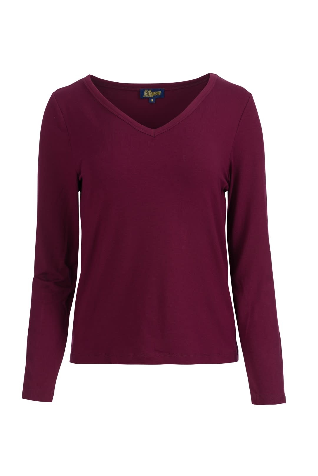 De Lynn Top van Lalamour in bordeaux is een fijne basic met V-hals en lange mouwen. Gemaakt van zachte viscose met stretch. Duurzaam, comfortabel en ideaal om te combineren.