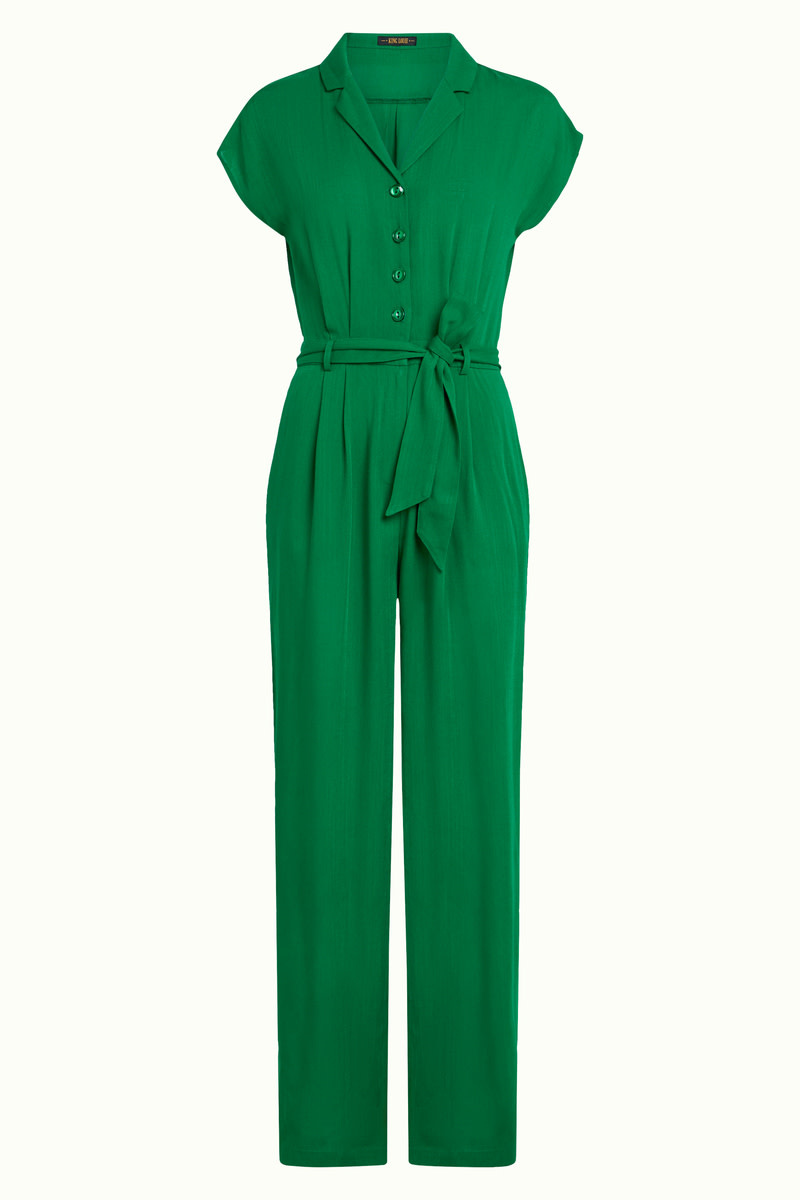 De kleur Very Green is fris en levendig — precies zo’n kleur waar je gezicht van oplicht. De jumpsuit heeft een reverskraag, kapmouwtjes en een knoopsluiting aan de voorkant. De bijpassende strikceintuur geeft je taille net wat vorm, terwijl de rechte lange pijpen mooi soepel vallen.