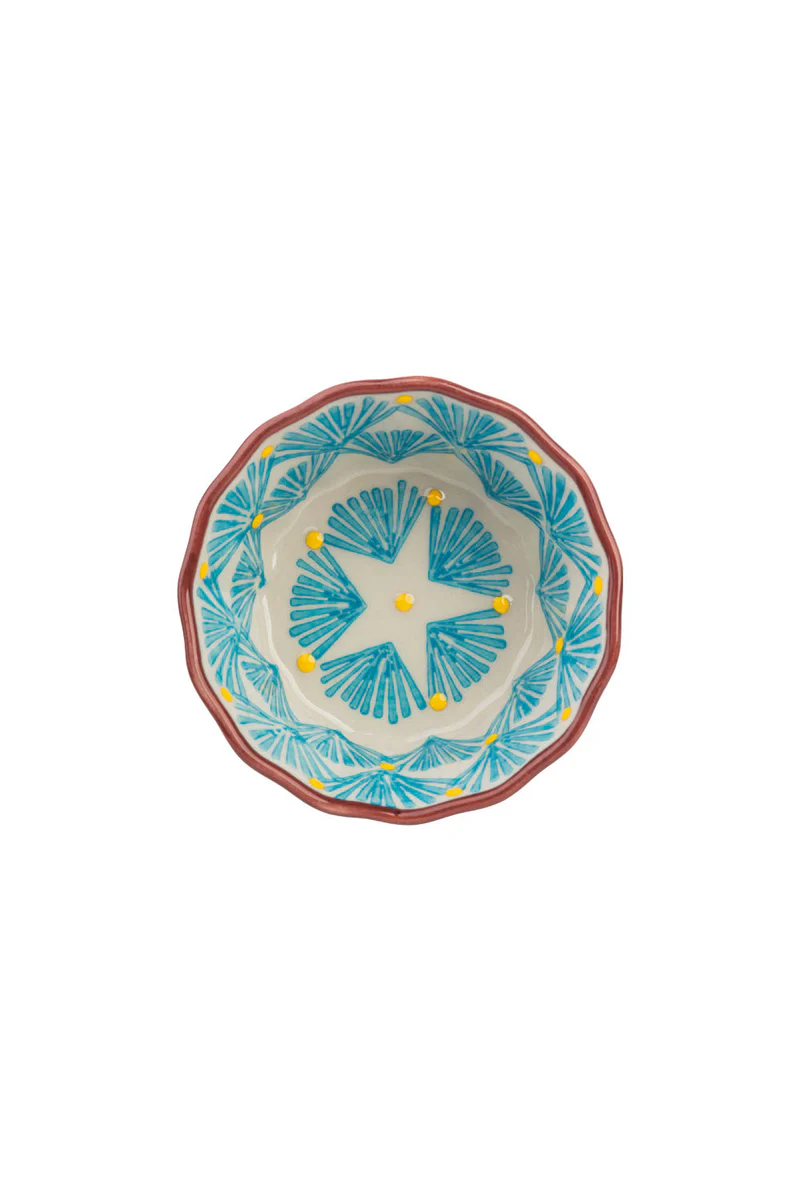 De Tranquillo muffinvorm Art Deco is een kleine blikvanger in de keuken en op tafel. Handgemaakt van hoogwaardig aardewerk en versierd met een turquoise waaierpatroon en gele stipjes, afgewerkt met een donkerrode rand. Elk exemplaar is uniek en draagt de speelse, kleurrijke stijl die zo kenmerkend is voor Tranquillo.