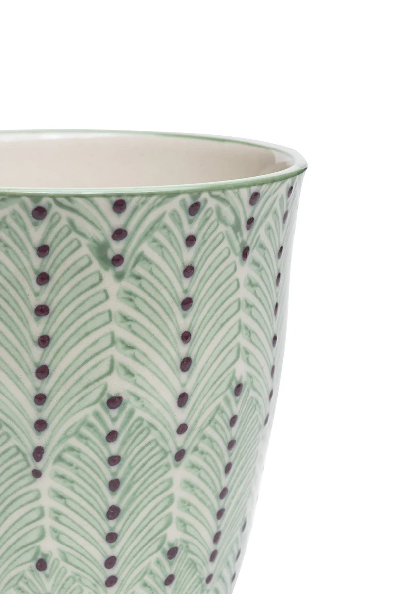 Deze Tranquillo mok in groen met violet accent is een blikvanger op tafel. Het subtiele patroon in frisse groentinten met dieppaars detail geeft de beker een stijlvolle en speelse uitstraling. Dankzij de inhoud van 300 ml en de afmetingen (10 x 8,5 cm) is dit een ideale mok voor een flinke kop koffie, thee of warme chocolademelk.