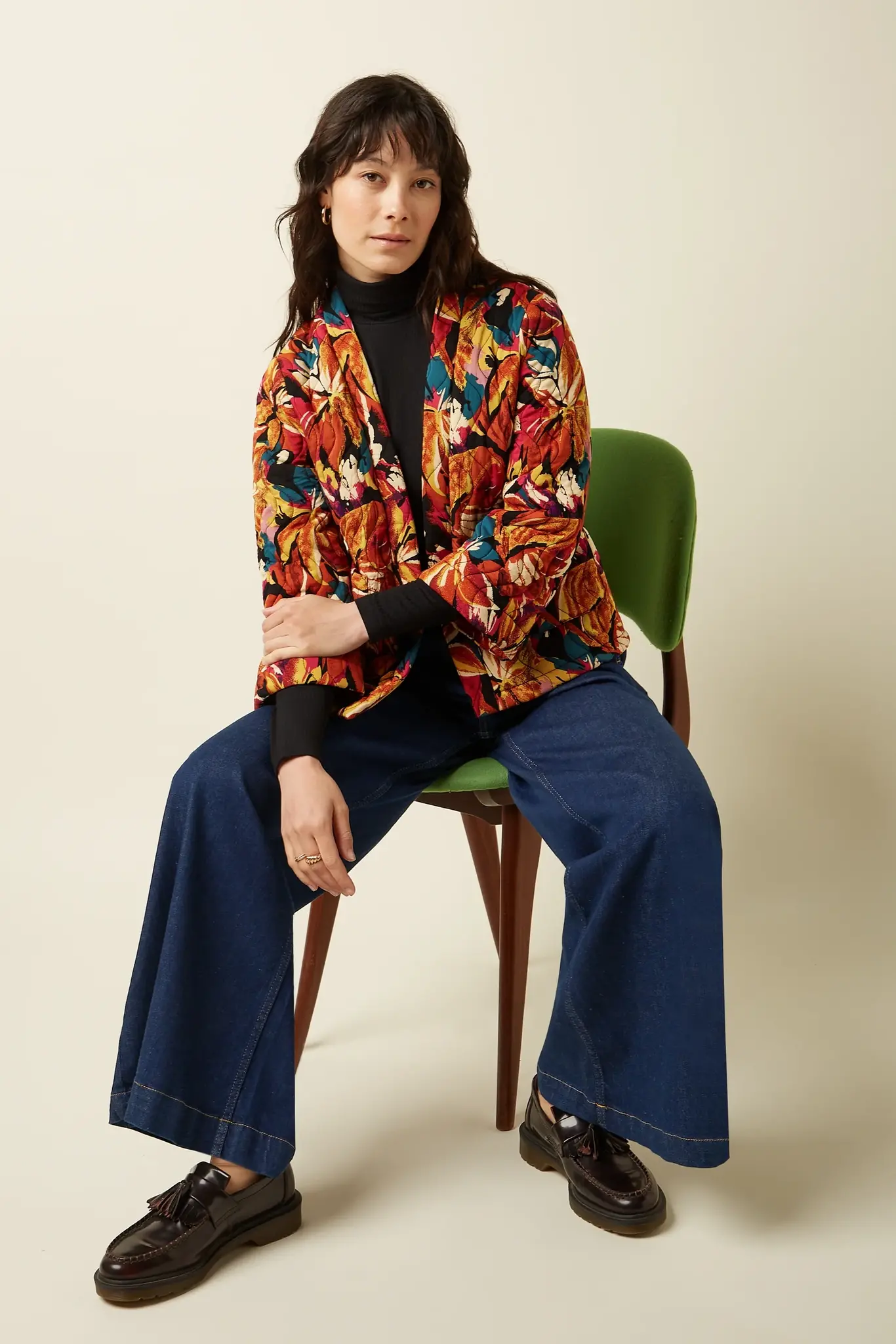 De bloemrijke print in warme, levendige kleuren maakt dit jasje een echte blikvanger. Het quilted ontwerp zorgt voor een subtiel reliëf en geeft het geheel een speelse én elegante uitstraling. De lange mouwen en patch pockets voegen niet alleen stijl maar ook functionaliteit toe, ideaal voor dagelijks gebruik.