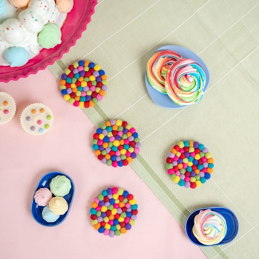 Set van 4 onderzetters, vrolijk gekleurde vilt balletjes. Doorsnede is 10 cm. Een feestje voor op je tafel toch? Met de hand gemaakt door vrouwen uit Nepal. Fair trade, Fair Made en Duurzaam.