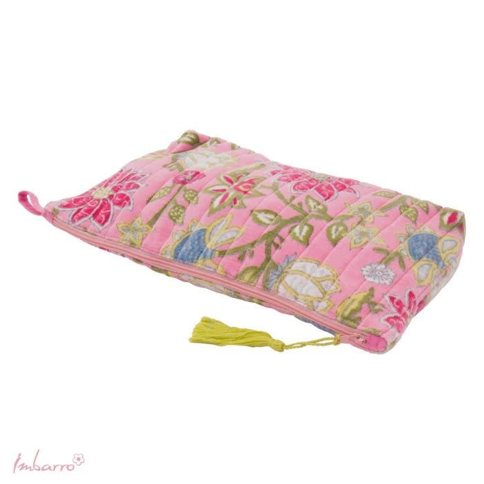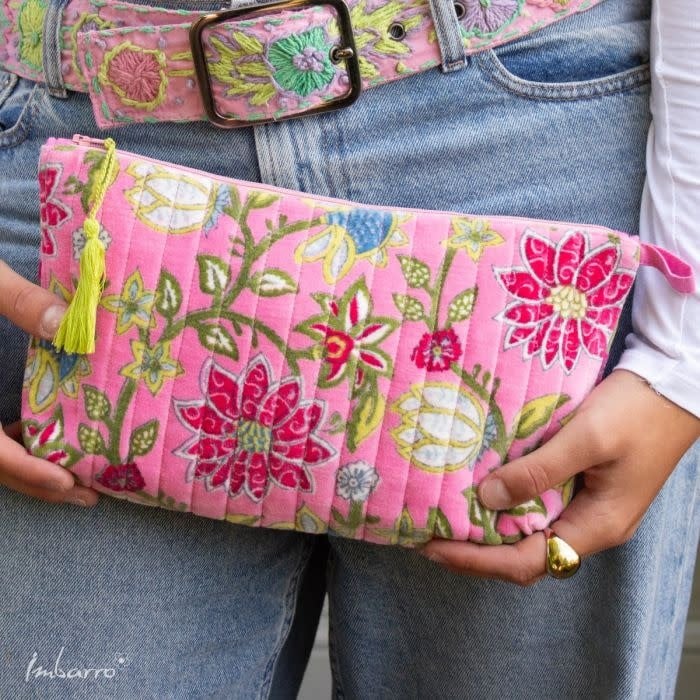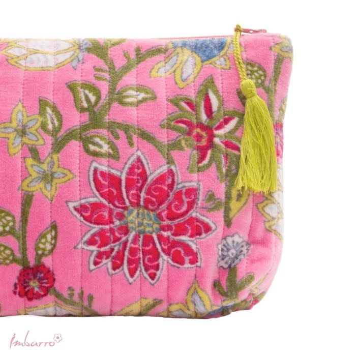 Deze pouch in roze is er zo eentje waar je meteen even naar kijkt… die warme kleur, de zachte glans van het velvet en die vrolijke bloemenprint — het voelt meteen gezellig. De Beatrice pouch van Imbarro heeft dezelfde fijne vorm als de Vivienne, maar dan in een net wat zachtere, roze uitstraling.