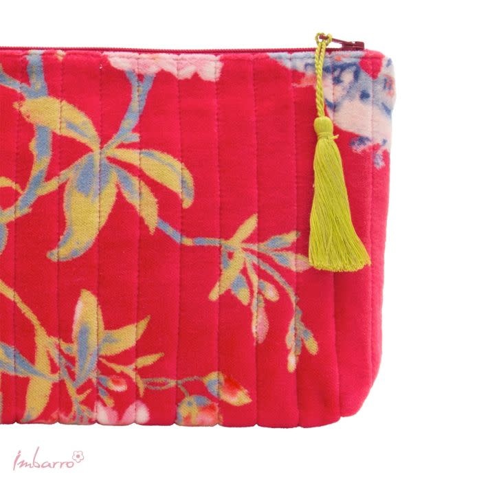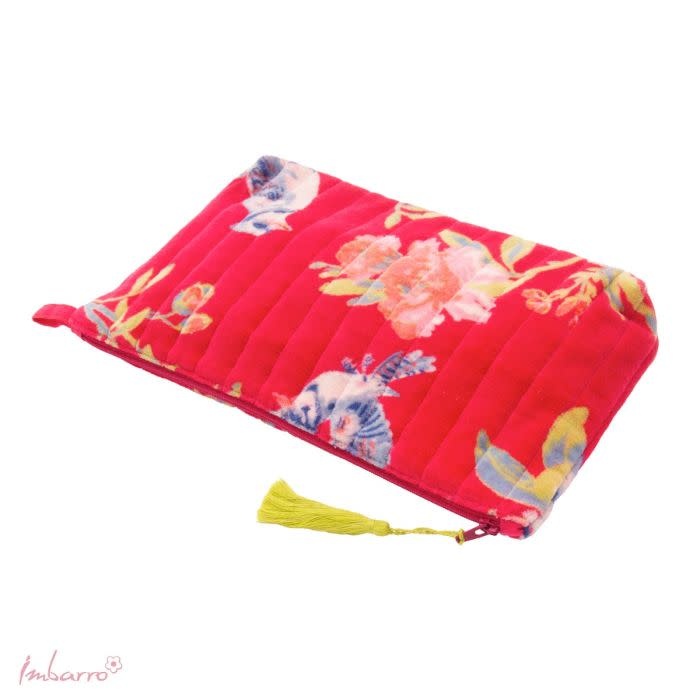 Deze pouch trekt meteen je aandacht… die diepe, warme kleur en dat zachte velvet — je wilt ’m eigenlijk meteen even vasthouden. De Vivienne pouch van Imbarro voelt fluweelzacht aan en heeft zo’n mooie, rijke uitstraling door de combinatie van het materiaal en de kleurrijke bloemenprint.