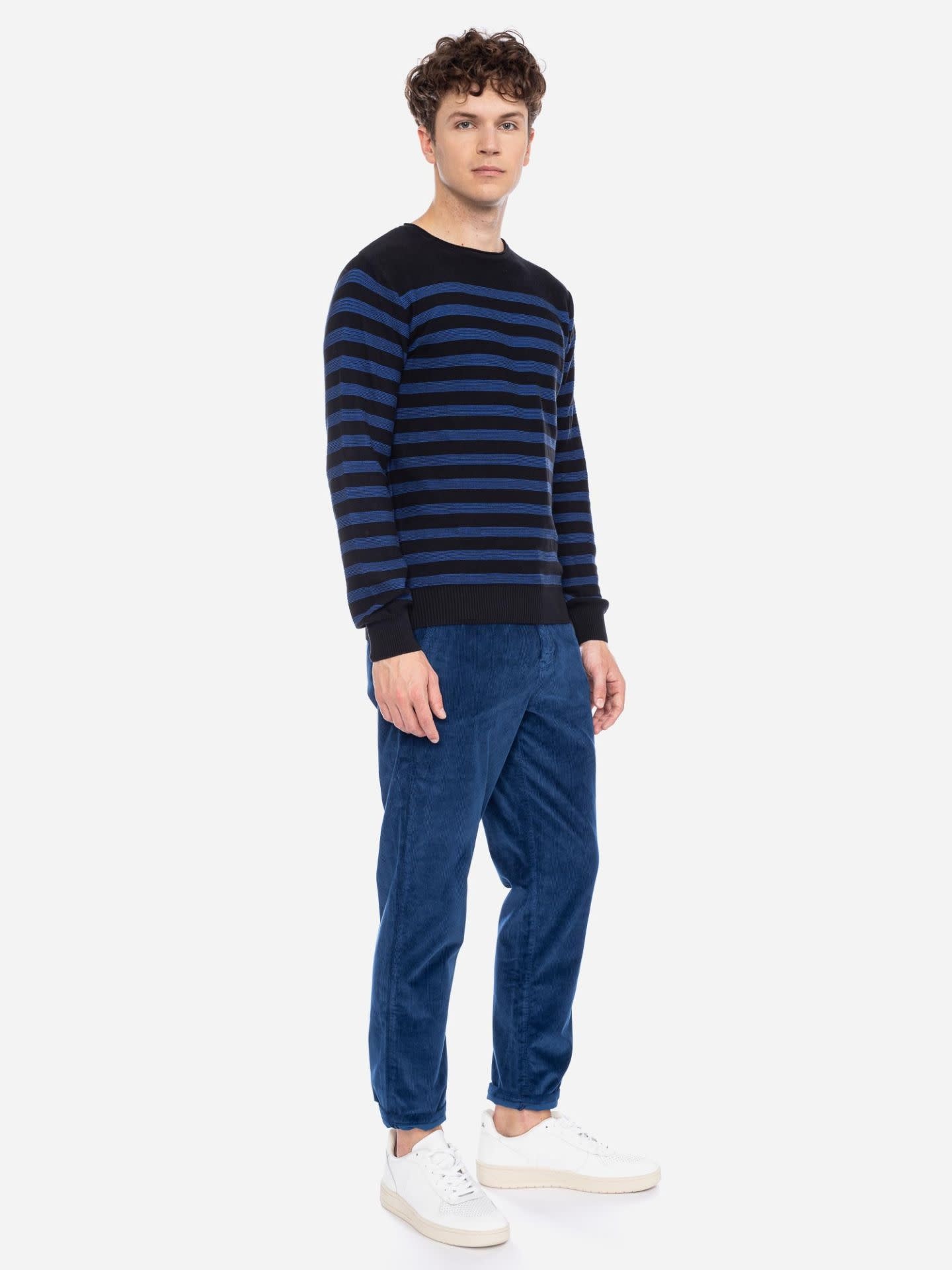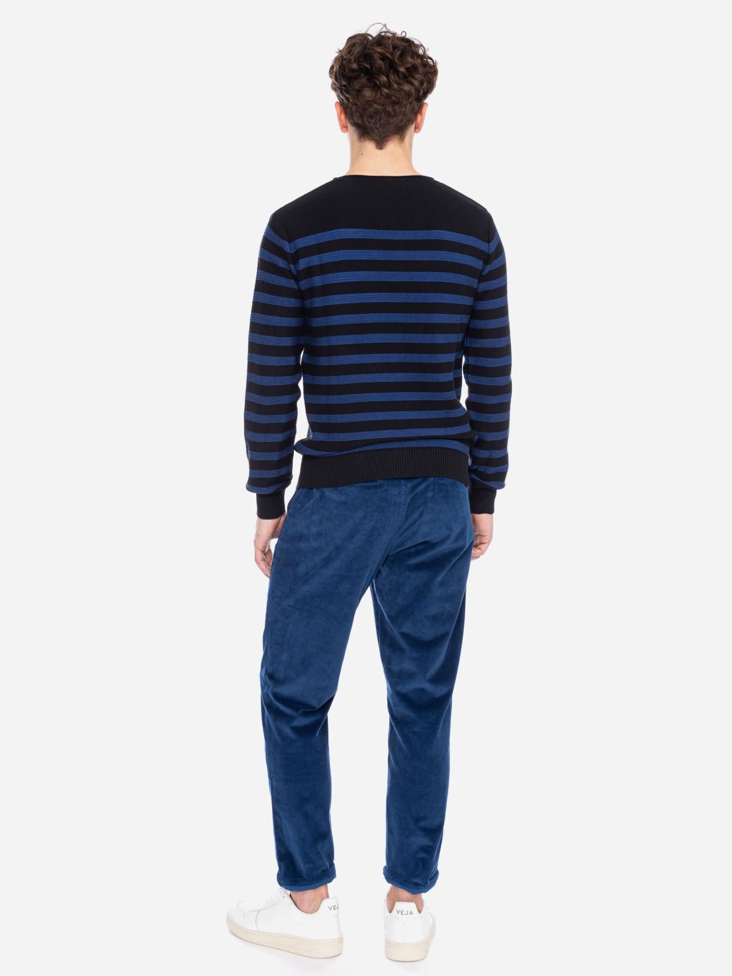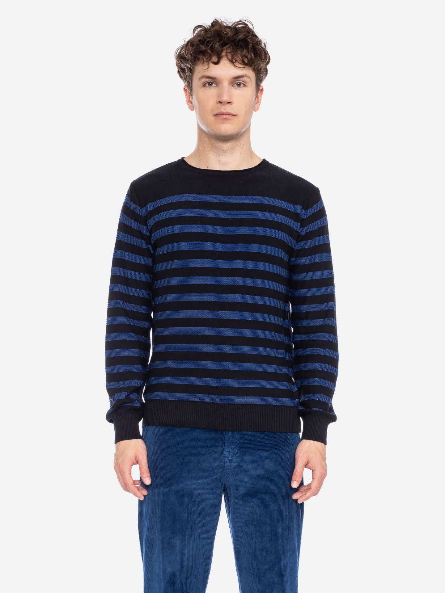Een mooie gebreide trui van ATO Berlin, draagt comfortabel en is gemaakt van 100% bio katoen. Mooi op een jeans of op een van de chino's van ATO Berlin. Zwart blauwe streep