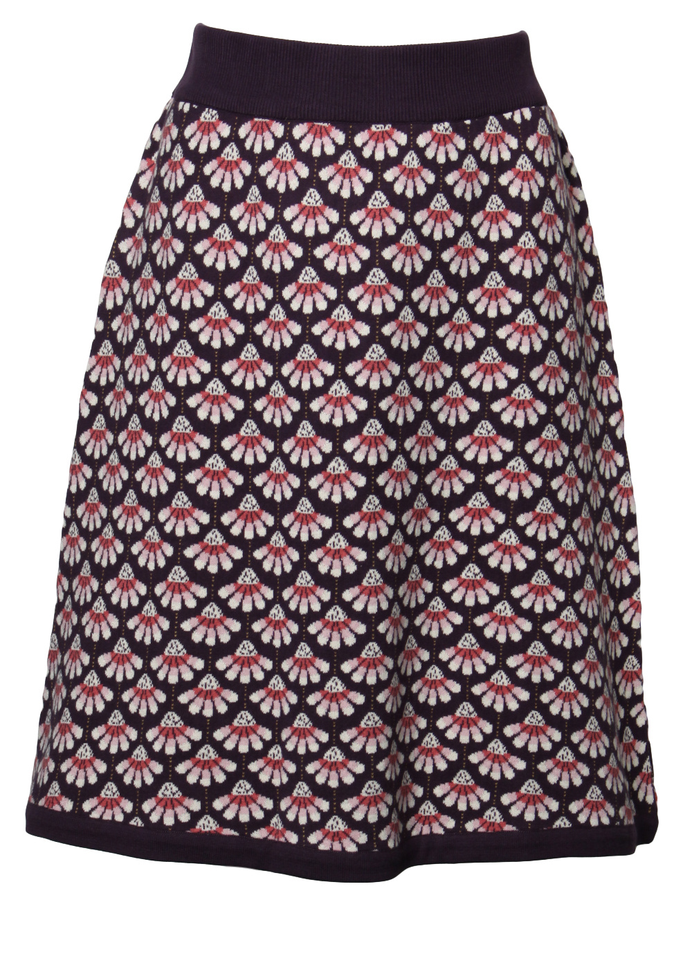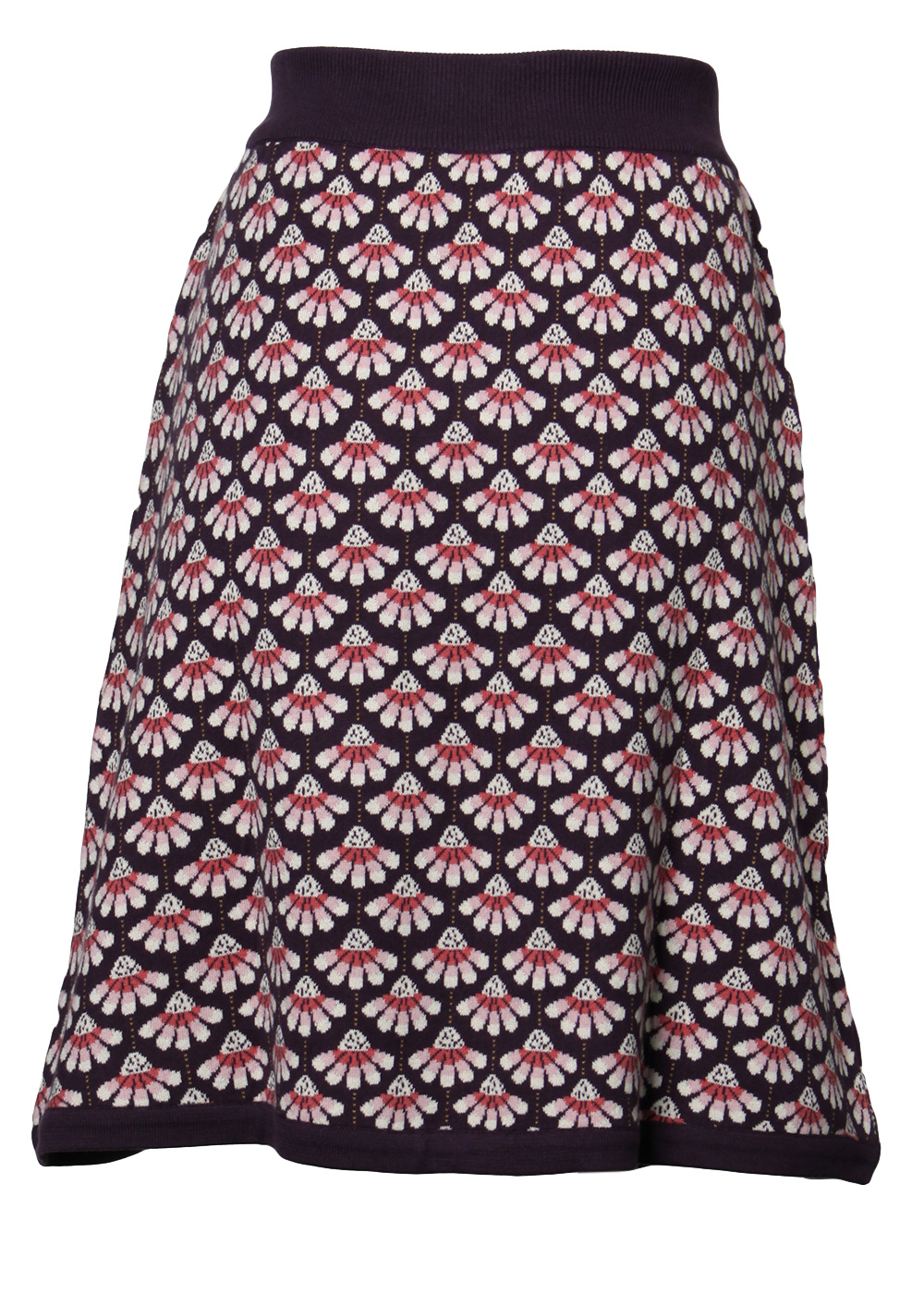 De Shuttle rok van Circus is een gebreide A-lijn rok van 100% biologisch katoen. Bordeauxrode basis met ingeweven bloemen in roze en ecru. Comfortabel en eigenzinnig.