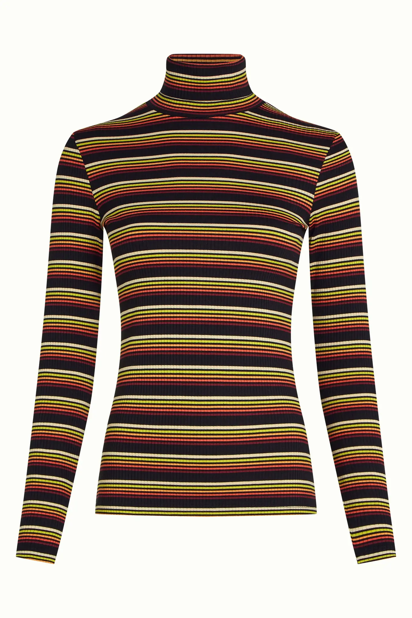 De King Louie Rollneck Top Frostine Stripe is een gestreepte coltrui van viscose jersey rib. Met stretch, lange mouwen en frisse kleuren in spicy orange.