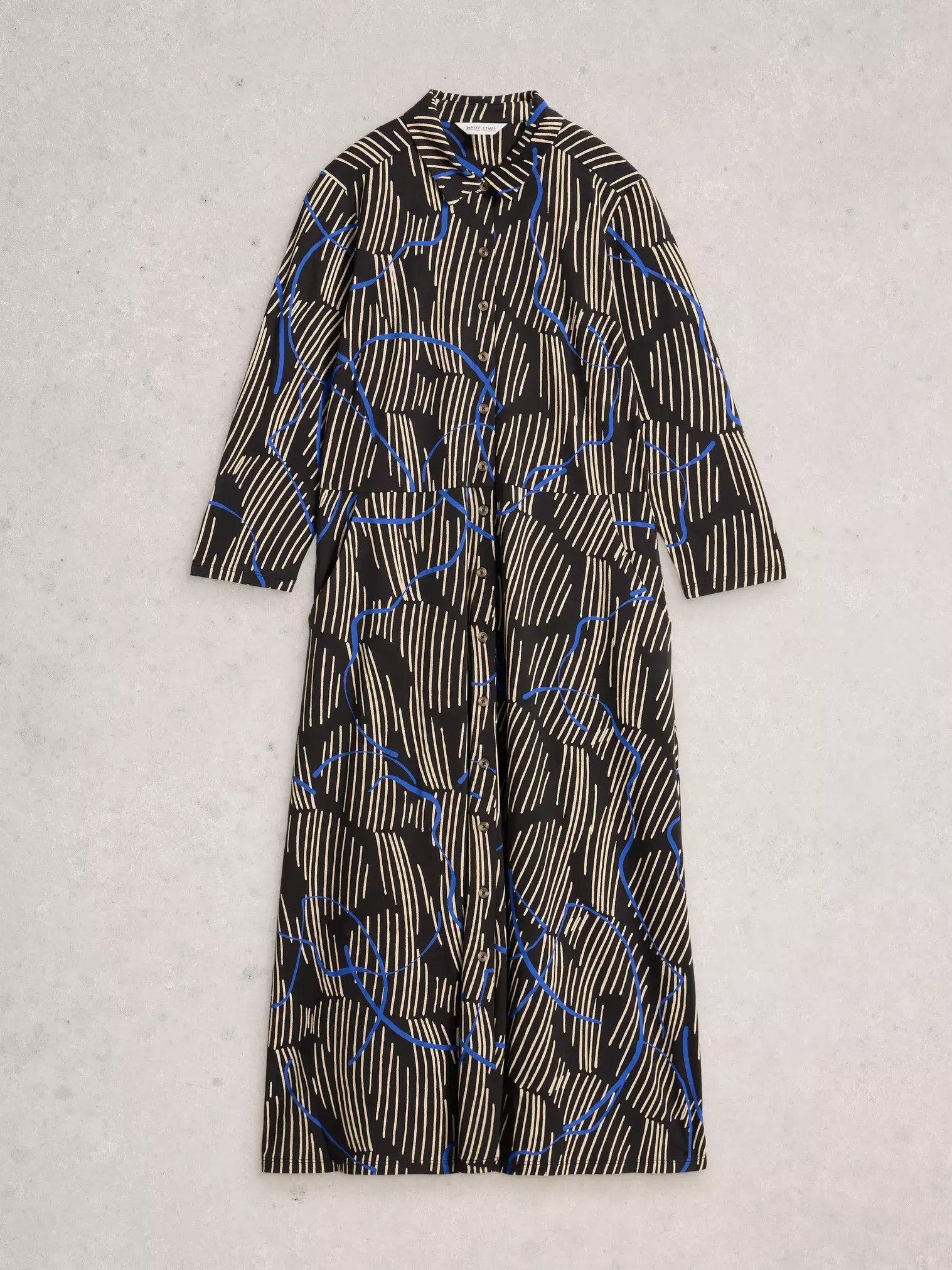 De Rua Jersey Shirt Dress van White Stuff in black print combineert stijl en comfort. Met kraag, 3/4 mouwen en midi-lengte. Verkrijgbaar bij Studio Marneth in Ulft.