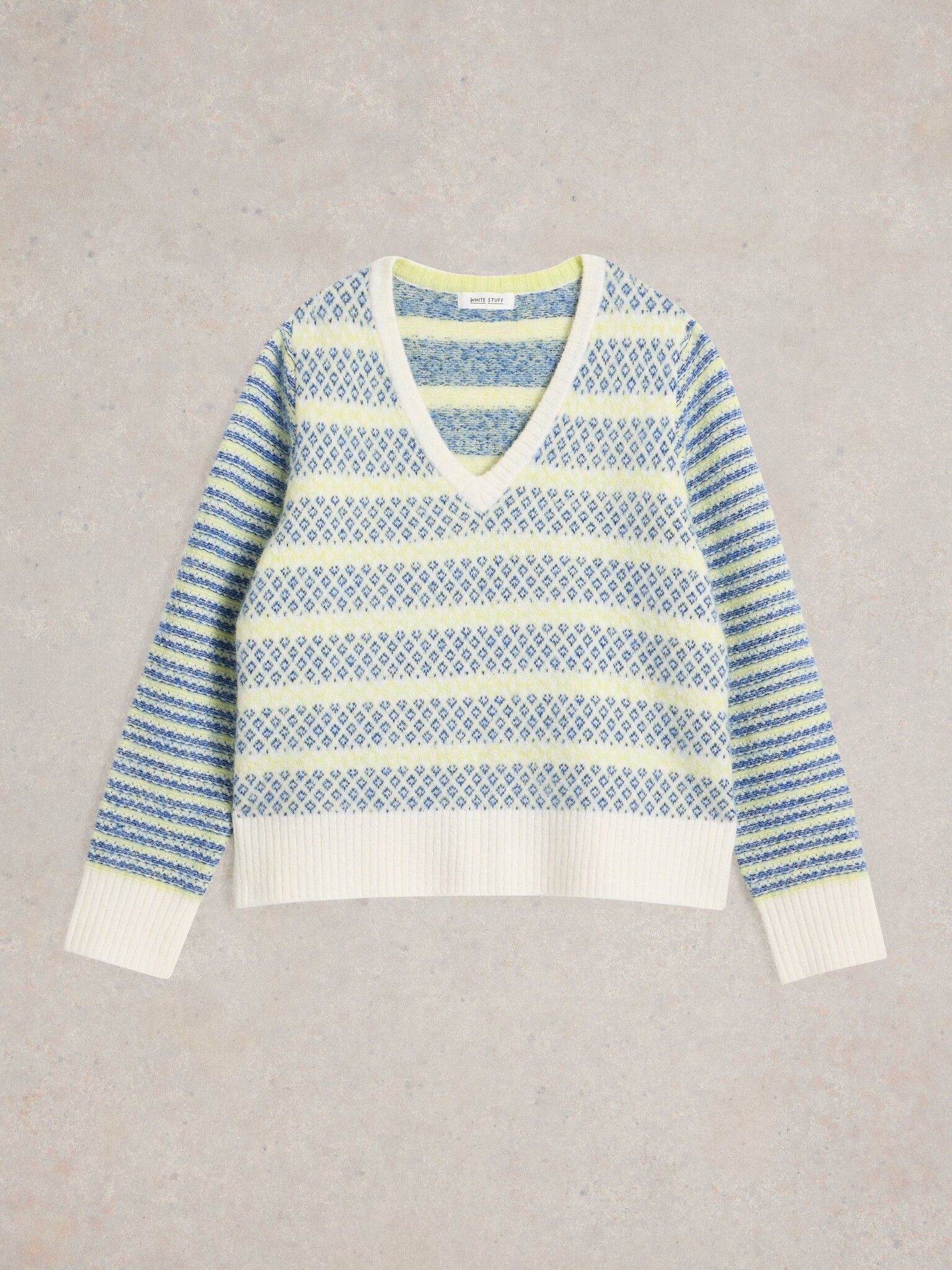Superleuke trui van White Stuff, met V-Hals. Materiaal: 40% RWS-wol, 40% gerecycled polyester, 14% nylon, 6% elastaan. Frisse tinten, blauw en geel op een witte achtergrond