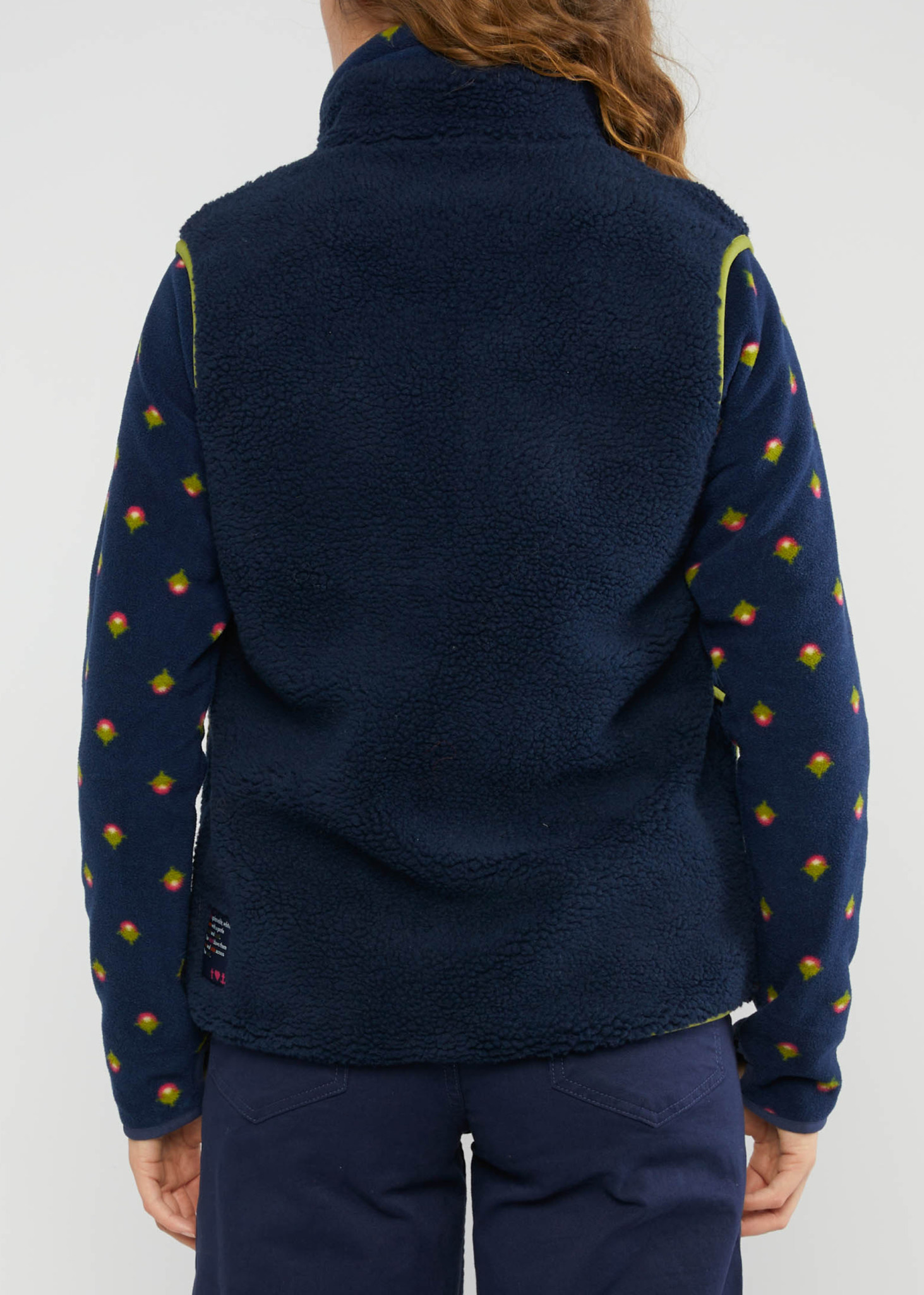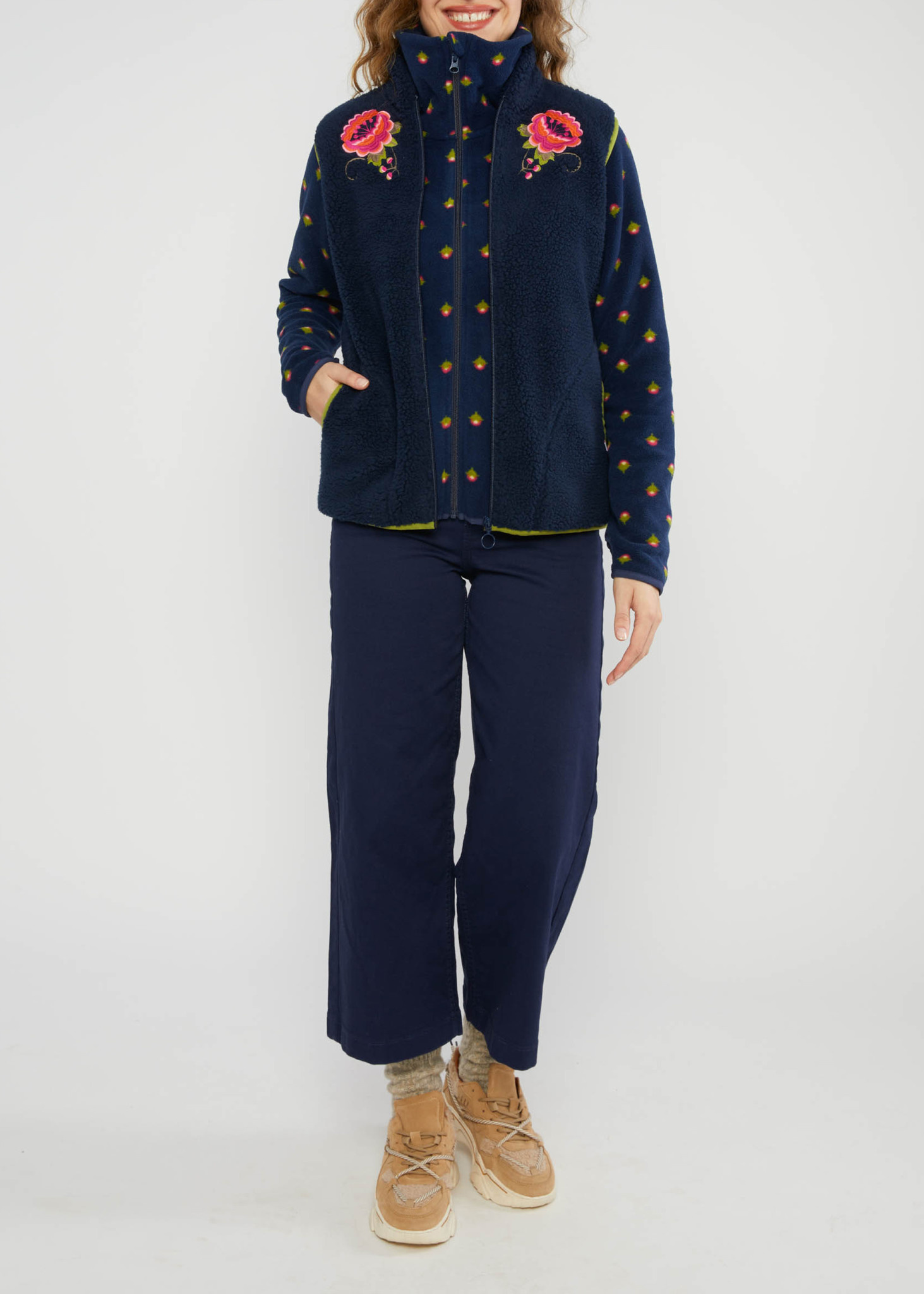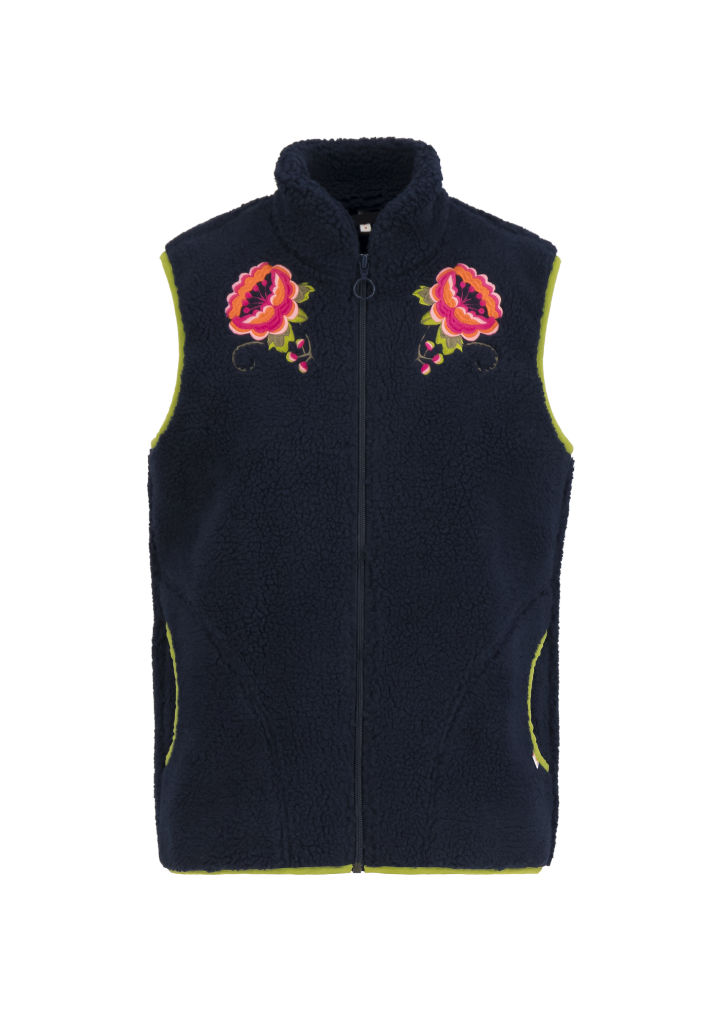Mooi mouwloos vest, bodywarmer in diepblauwe kleur met contrasterende groene biezen en bloemen borduursel op de borst. Zachte fleece teddy gemaakt van gerecyclede polyester. Voering 100% polyester. Praktische zakken.