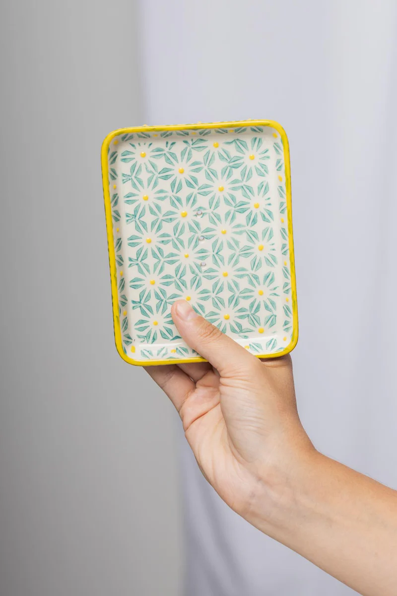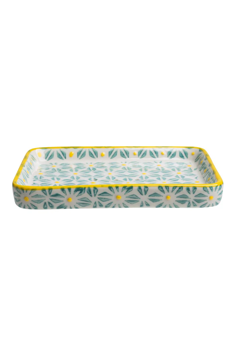 De Tranquillo soap dish Retro (13,5 x 9,5 x 2 cm) is een handgemaakt aardewerken zeepbakje met retro bloemenprint en gele rand. Ideaal voor zeep of sieraden.