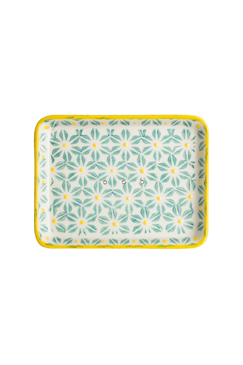 De Tranquillo soap dish Retro brengt een vleugje vrolijke nostalgie in je badkamer of keuken. Dit handgemaakte schaaltje van aardewerk heeft een speelse retro bloemenprint in groen en geel, afgewerkt met een zonnig gele rand. De kleine gaatjes in het midden zorgen ervoor dat water goed wegloopt, zodat je zeep langer mooi blijft.