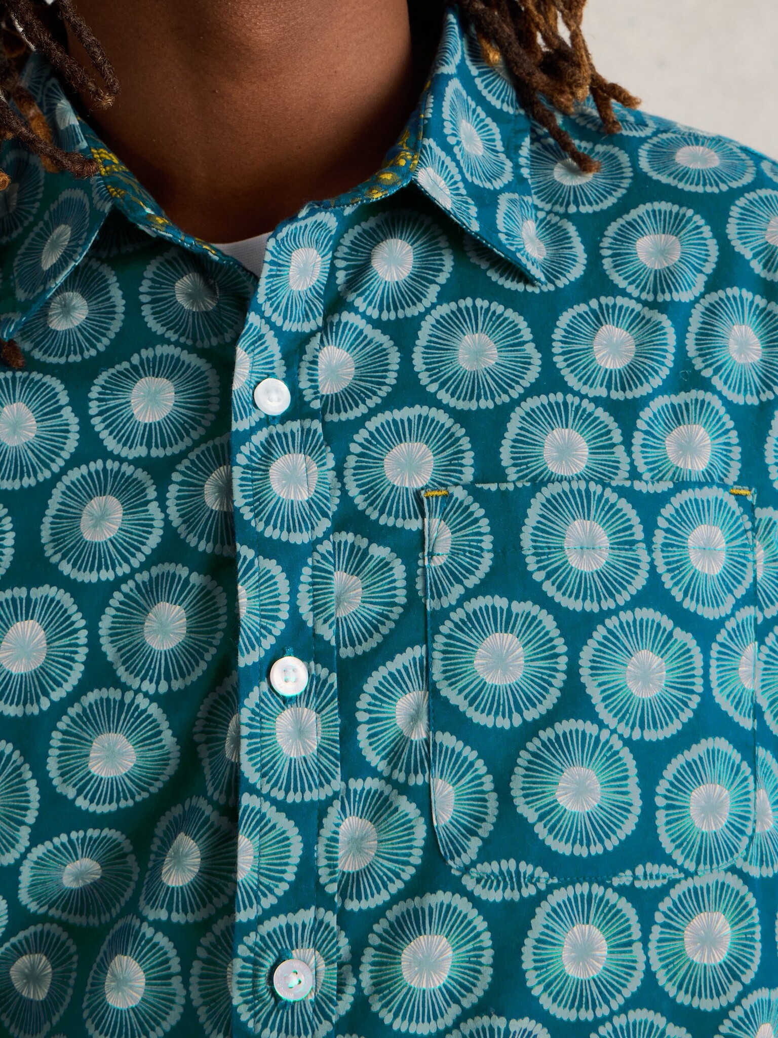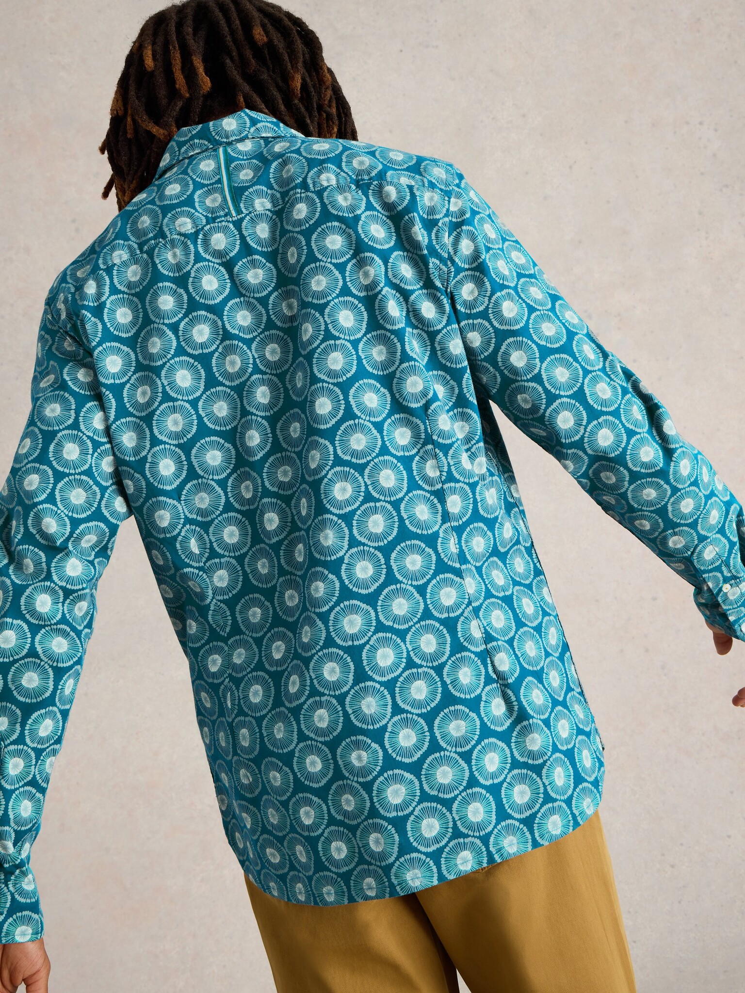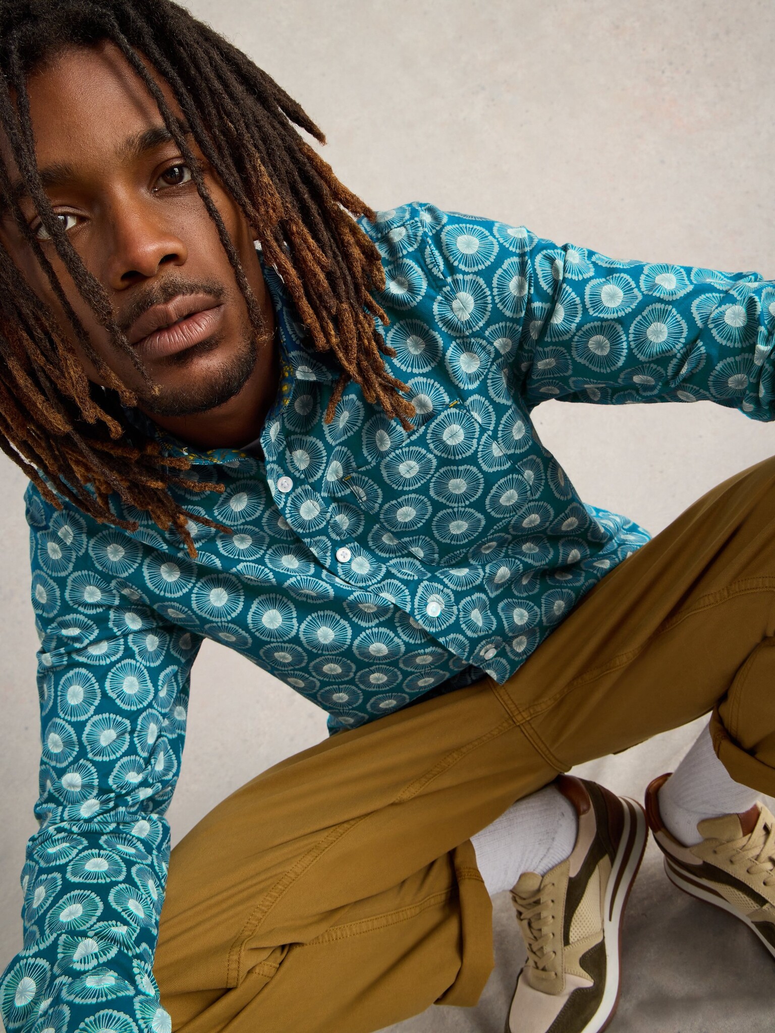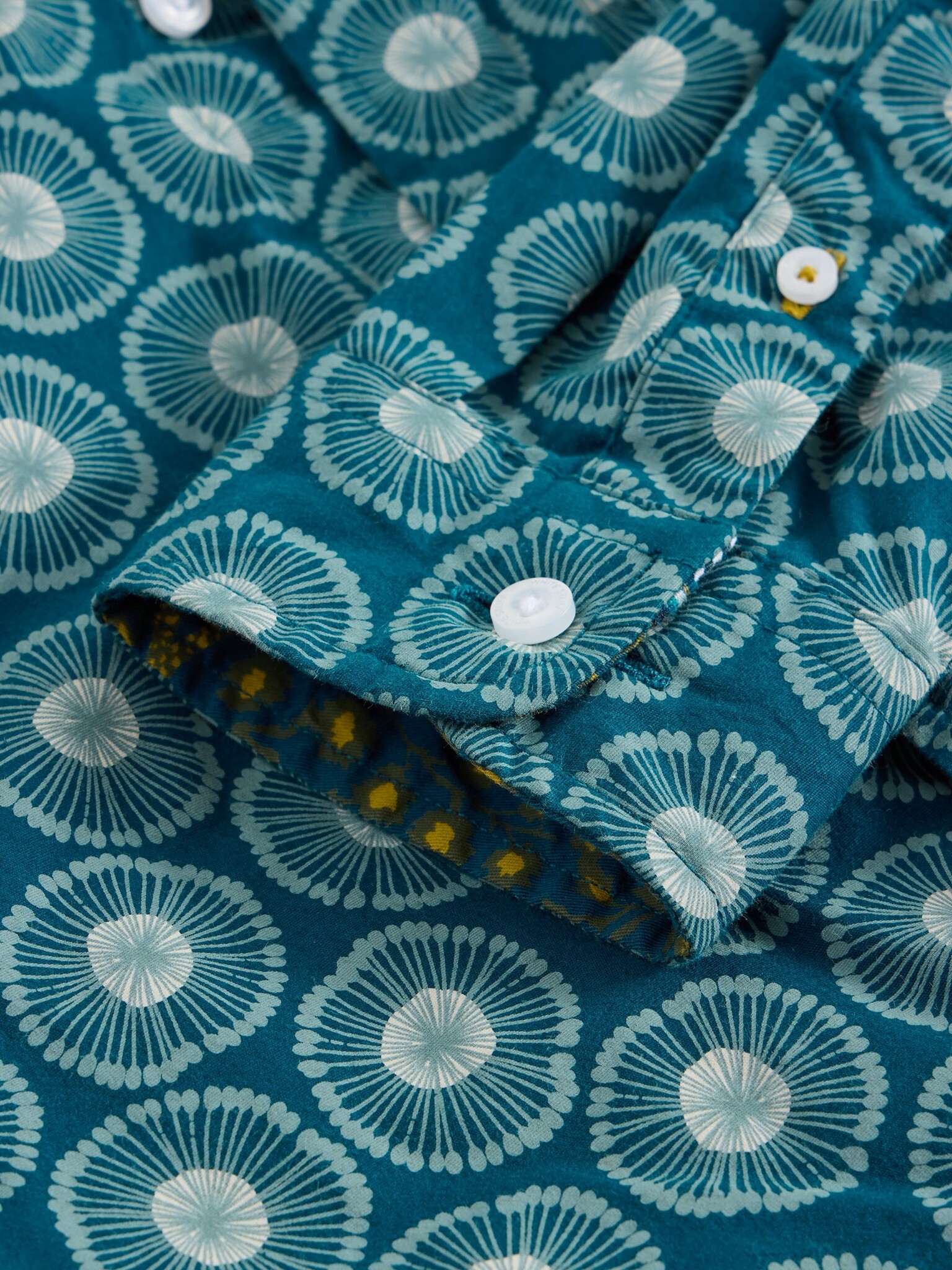 Mooi overhemd met petrolblauwe ondergrond en een organische print. Materiaal is 97% biokatoen en 3% elasthan.