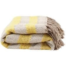 Zacht woonplaid van Imbarro in frisse geel-ecru streep. Gemaakt van 80% katoen, 20% acryl. Heerlijk luchtig, natuurlijk en vrolijk. Perfect voor op de bank of als sfeermaker in huis.