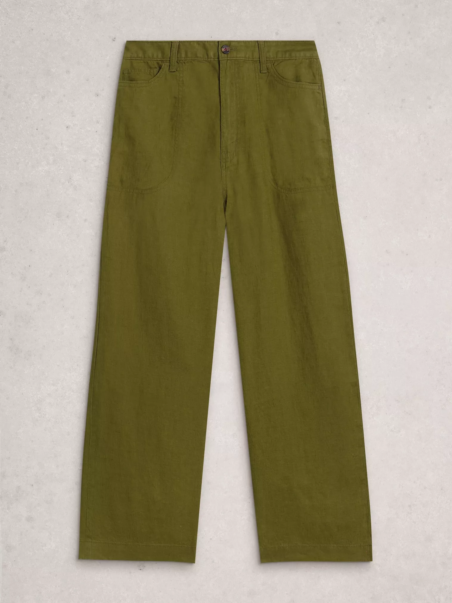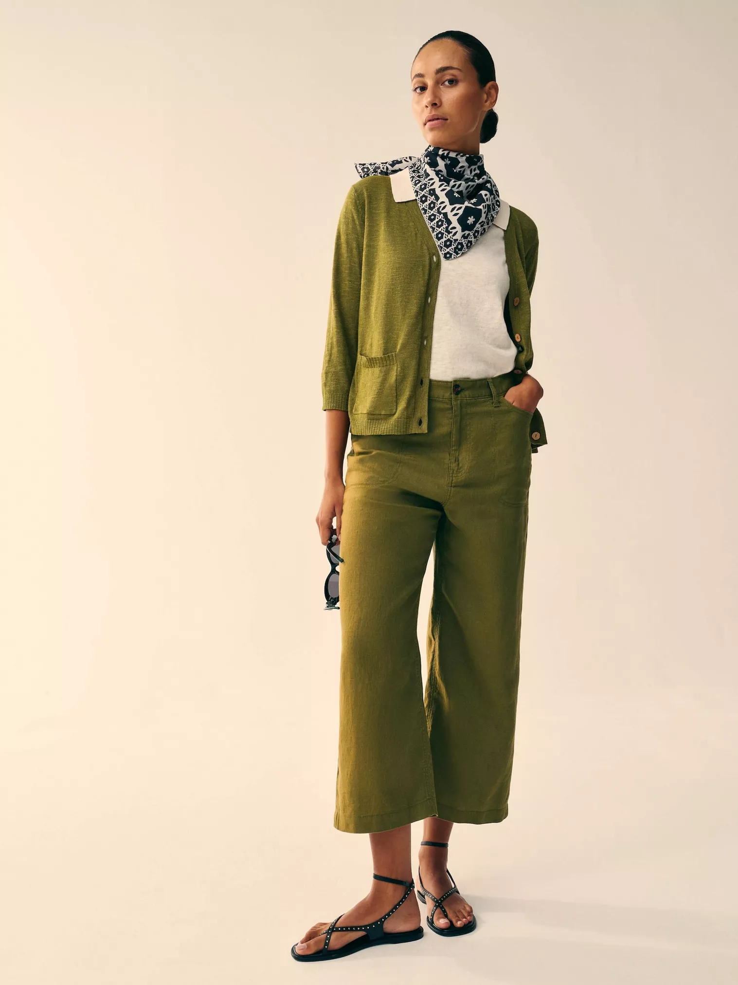 Een luchtige linnen broek met wijde pijpen in een natuurlijke groentint. Comfortabel, soepel en perfect voor warme dagen. Een fijne basis met een ontspannen uitstraling. De broek heeft een 7/8 lengte