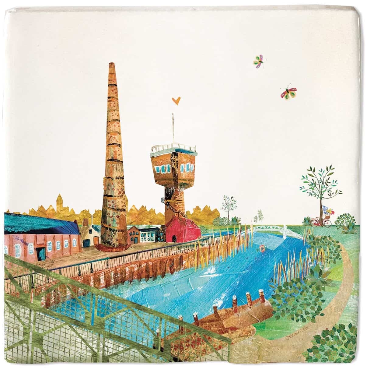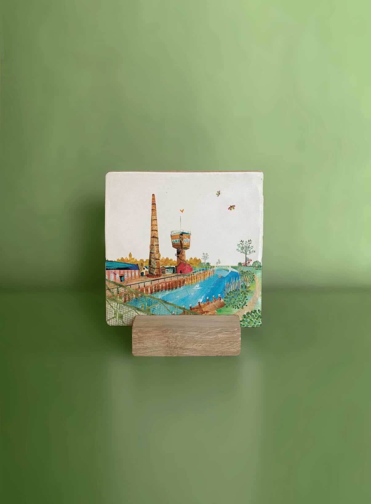 Denk je aan Ulft, denk je aan de DRU toren, de schoorsteen, het monument voor de arbeider, de groene brug en de Oude IJssel. Al dit moois nu op een eigen Ulfts tegeltje, 10*10 cm, handgemaakt aardewerk.