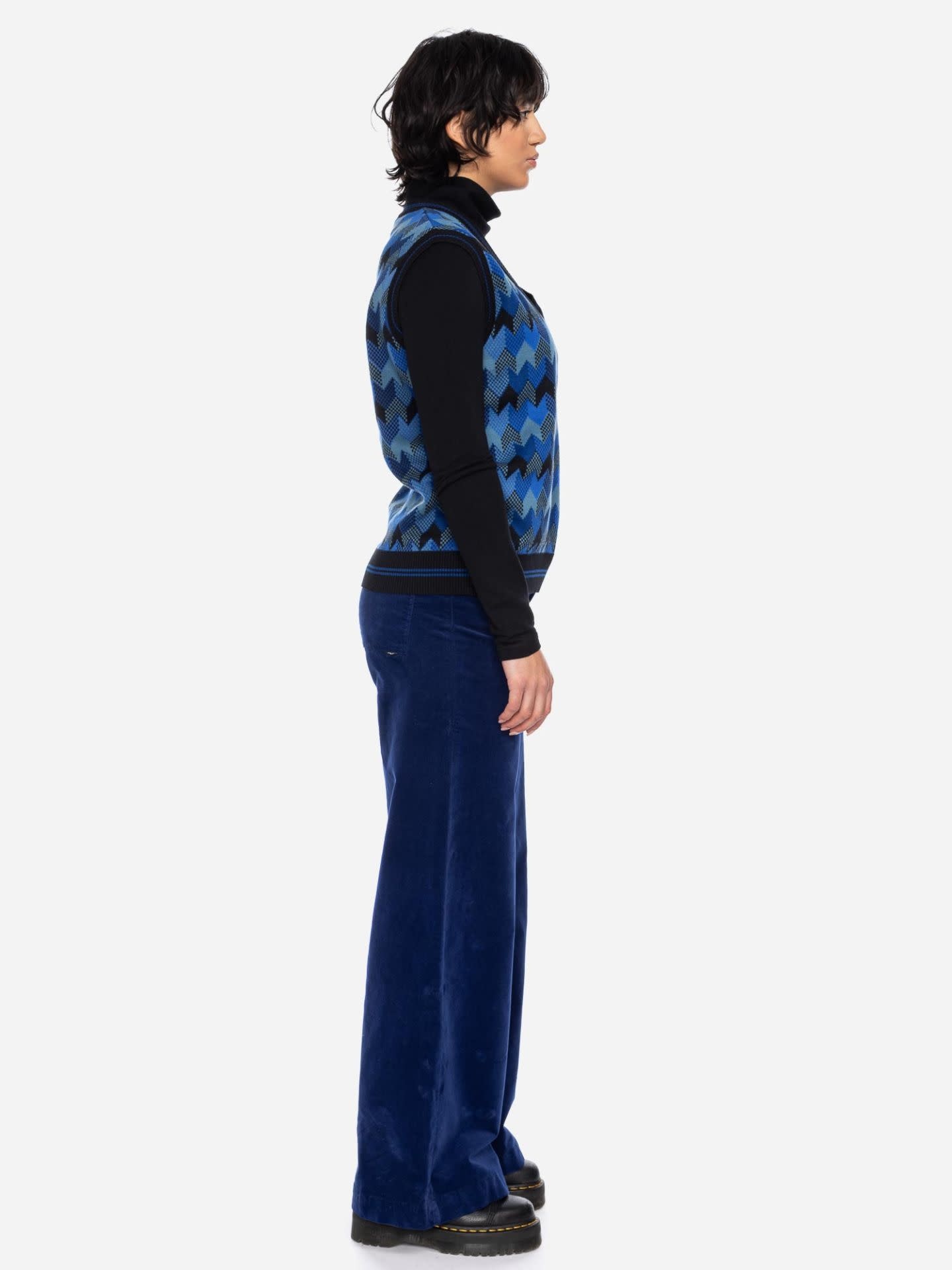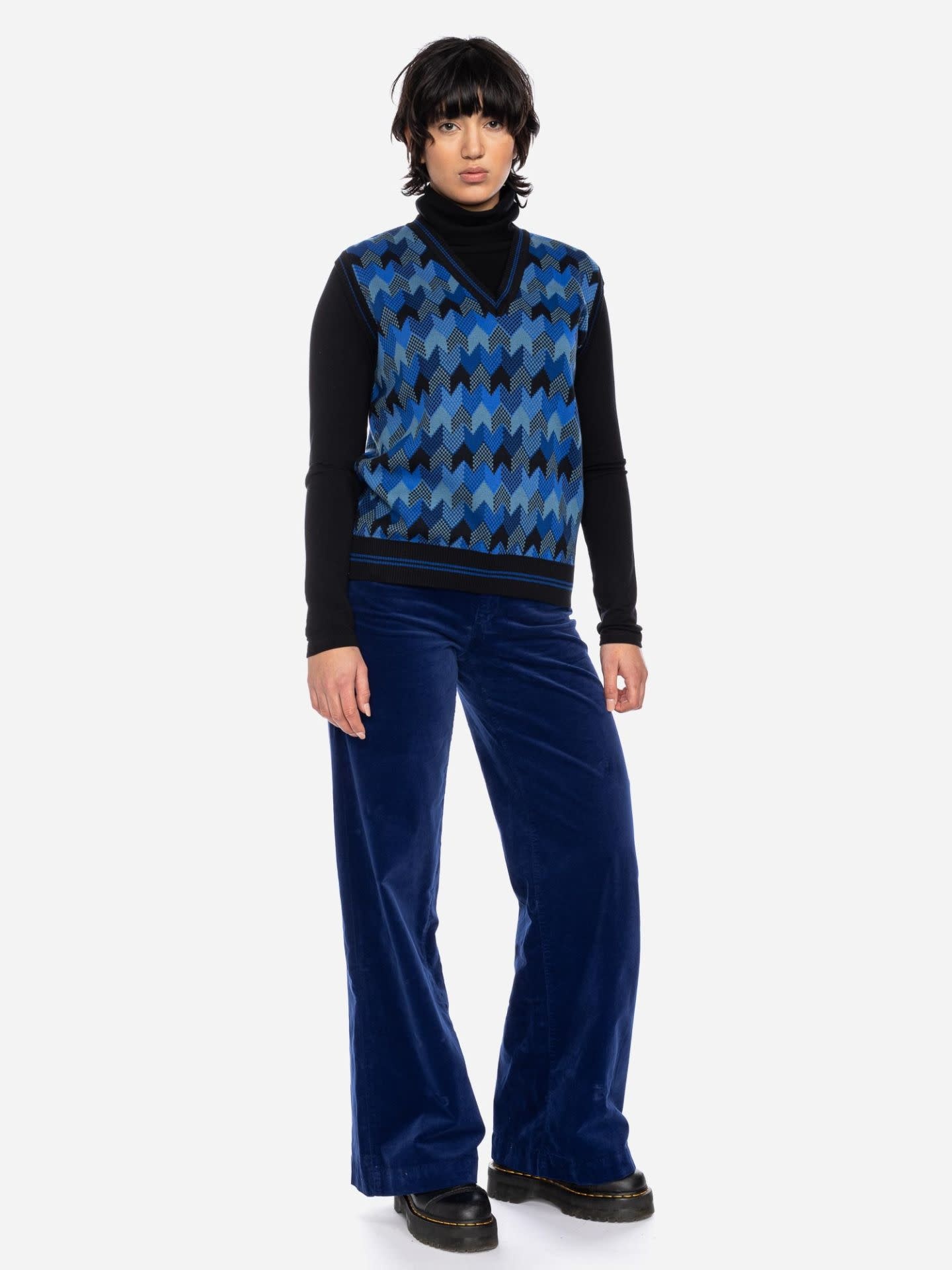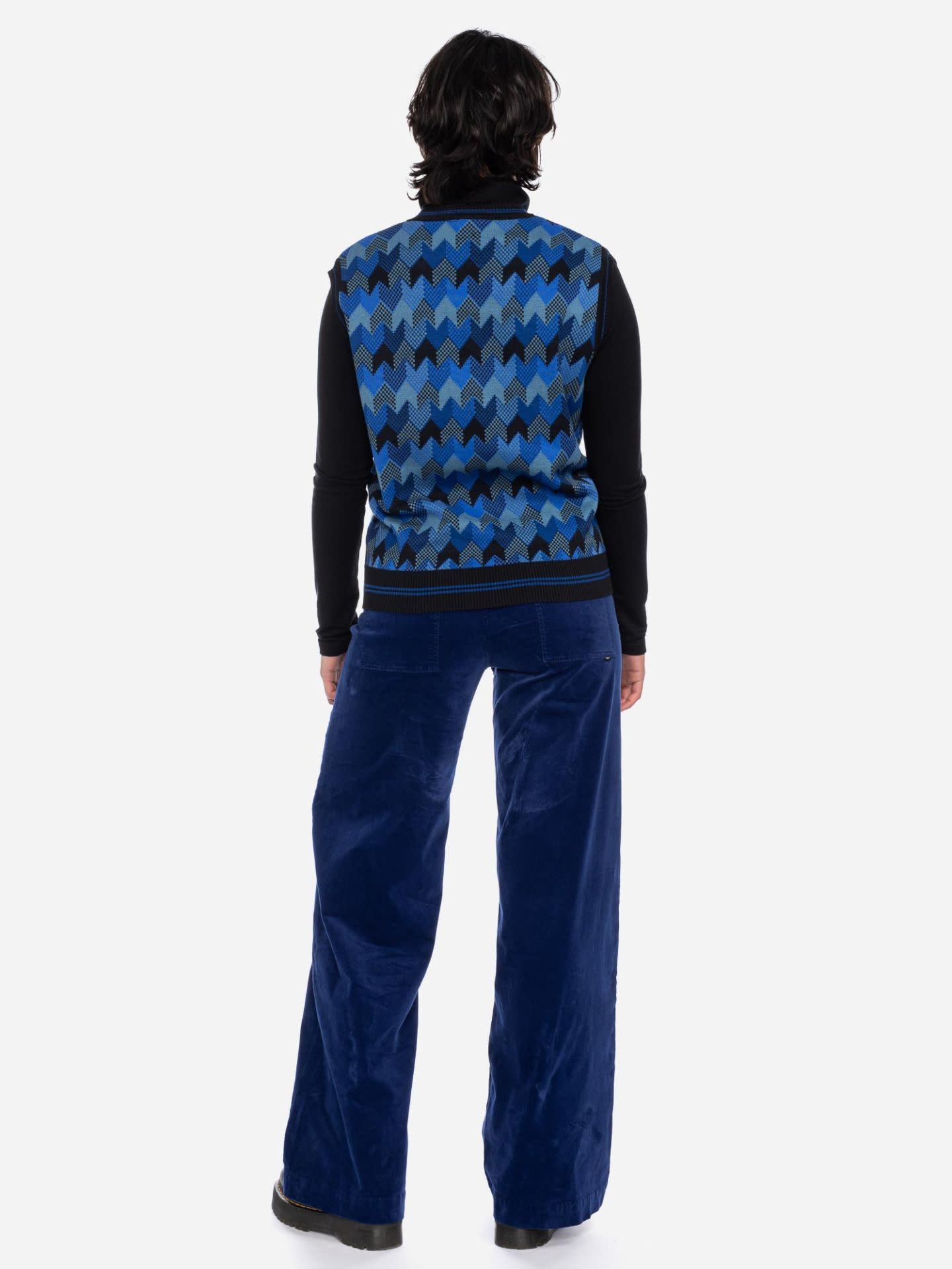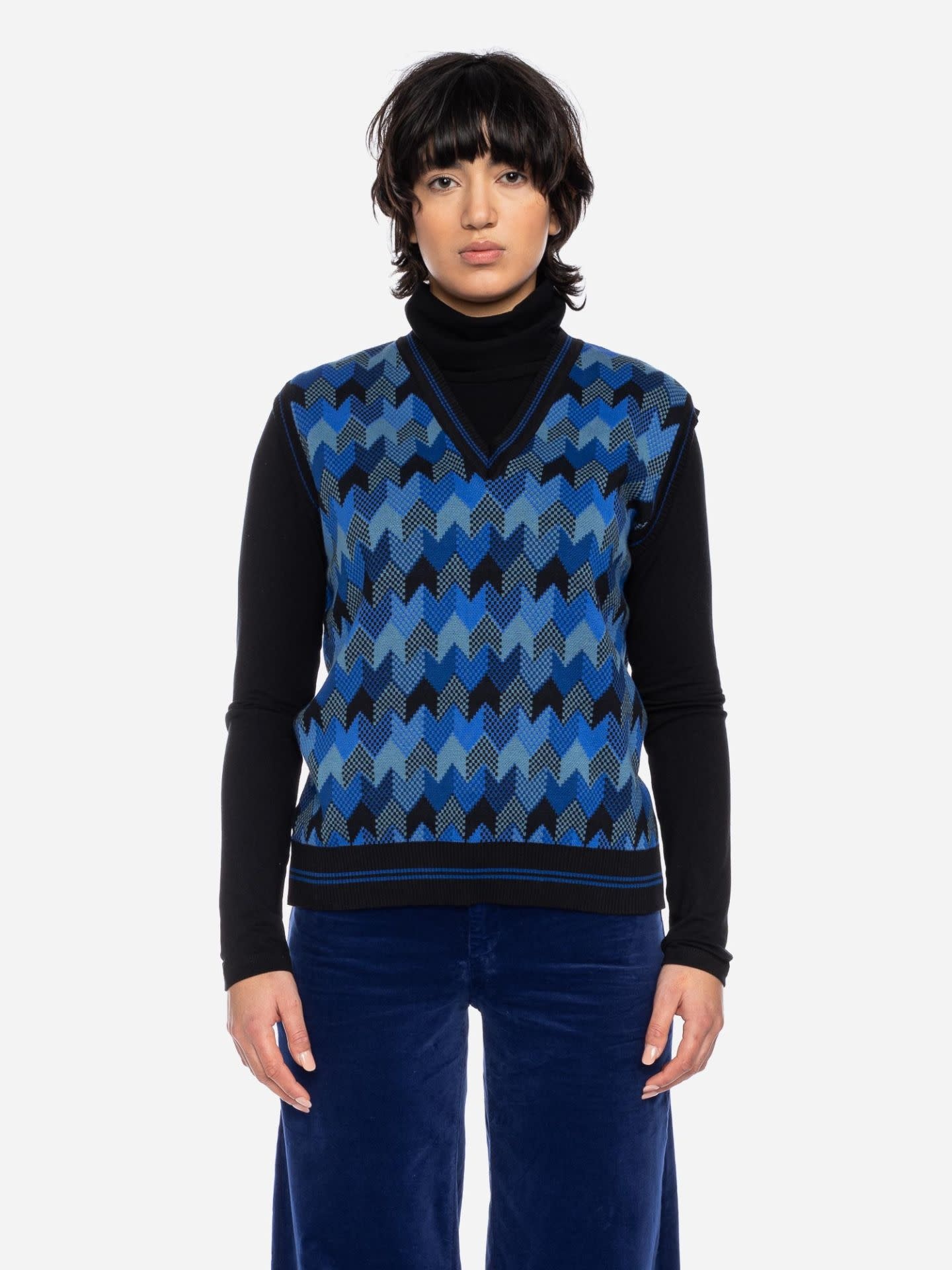 Vrouwelijke heuplange spencer van Ato Berlin. Grafisch patroon in blauw, zwart tinten. Met een V-hals. Mooi over een koltrui of blouse maar ook zo als top te dragen. 100% organic katoen