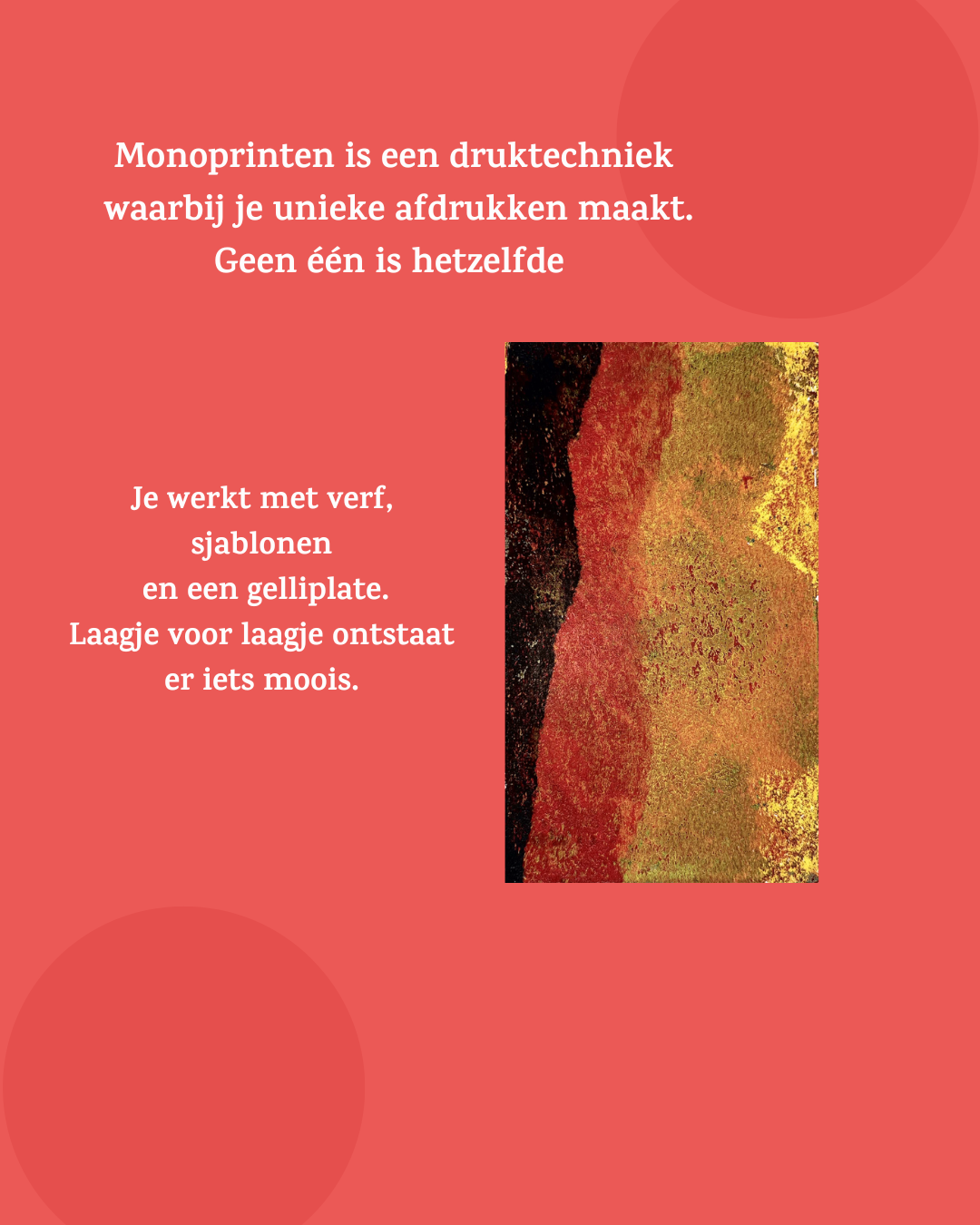 Ontdek monoprinten: een speelse druktechniek met verf en sjablonen. Je maakt meerdere unieke prints in lagen. Geen ervaring nodig, wel zin om lekker creatief bezig te zijn.