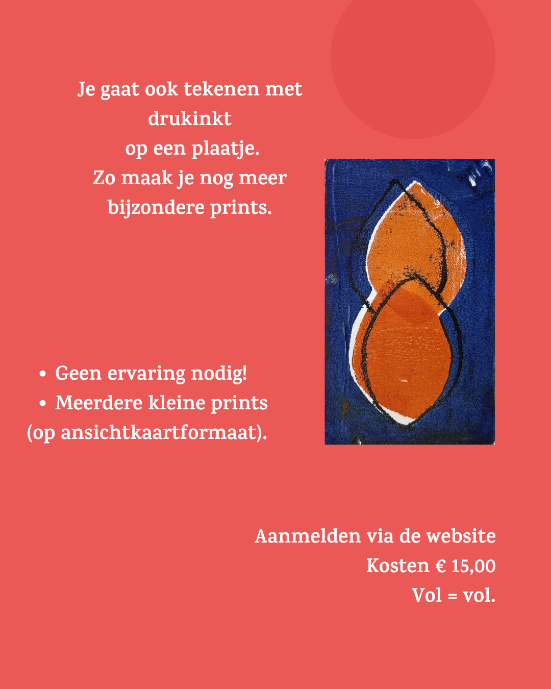 In deze workshop gaan we werken met een gelliplate. Zo’n gelliplate is een flexibele plaat. Met behulp van acrylverf en sjablonen kunnen vanaf de gelliplate zogenaamde monoprints worden gemaakt. Een monoprint is een eenmalige afdruk in één of meerdere lagen. We werken op ansichtkaartgrootte. Monoprinten is deels experimenteren met kleur en verf. Tijdens de workshop kun je diverse afdrukken maken. Een tweede techniek die we gebruiken is een monoprint vanaf een inktplaat, een aluminium plaatje dat is ingerold met zwarte drukinkt. Hiermee kun je een tekening overbrengen op papier. Beide technieken zijn ook te combineren. Het is een relatief eenvoudige technieken, waar iedereen mee kan werken. De resultaten zijn vaak verrassend, vooral niet helemaal voorspelbaar en ze zijn allemaal uniek
